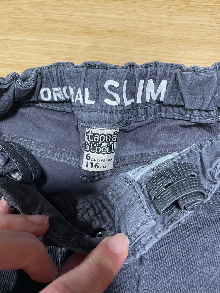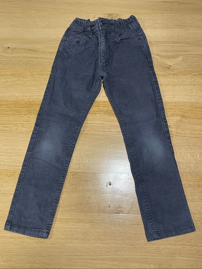 - un pantalon slim en velours milleraies, marque Tape à l’œil. Taille resserrable par boutons et élastique. Genoux un peu râpés.