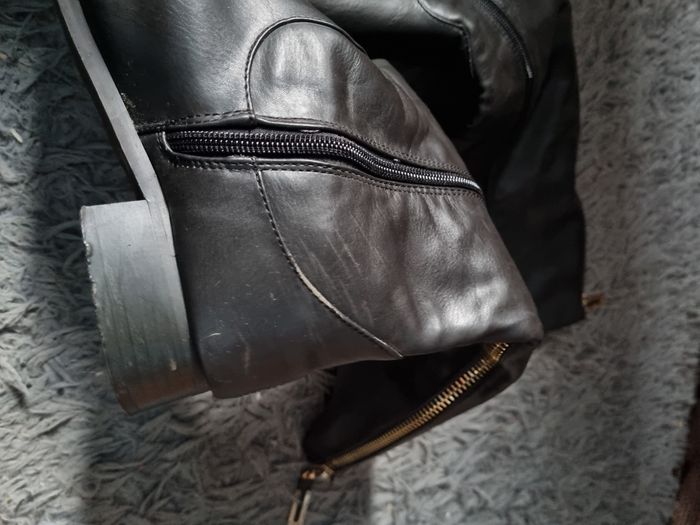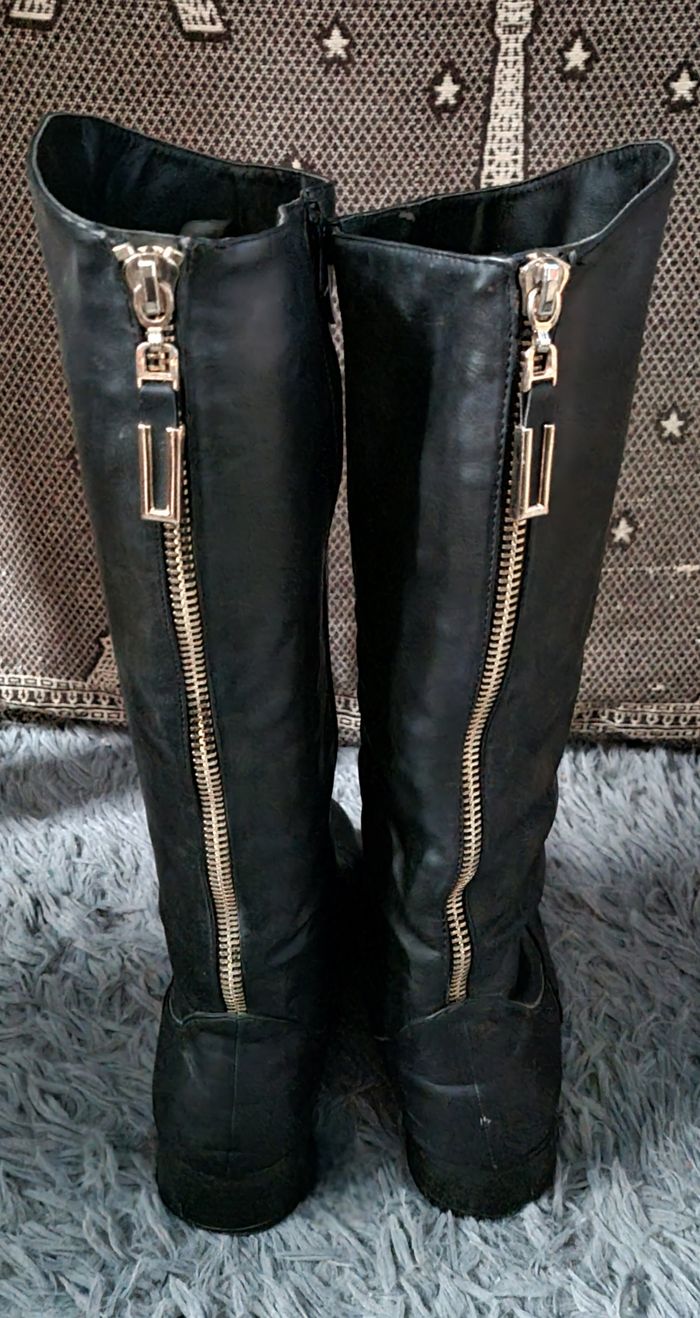 Bottes haute marron en cuir intérieur fourré,pointure 40,zip sur le côté intérieur, faux zip à l'arrière, hauteur avec talon 43cm ,hauteur talons 3cm,légers défauts voir photos.