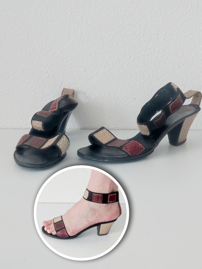 Sandales à talons cuir nuir motif carré beige rouge vintage - 39