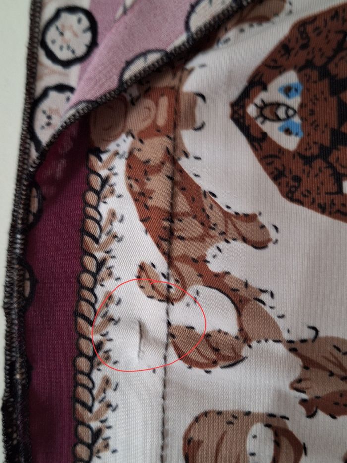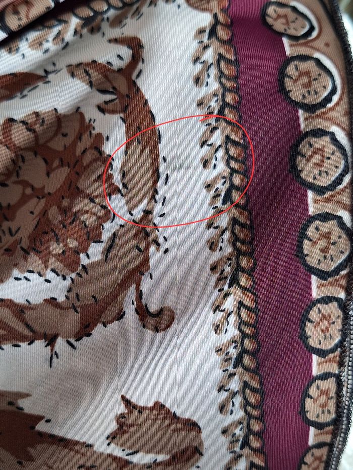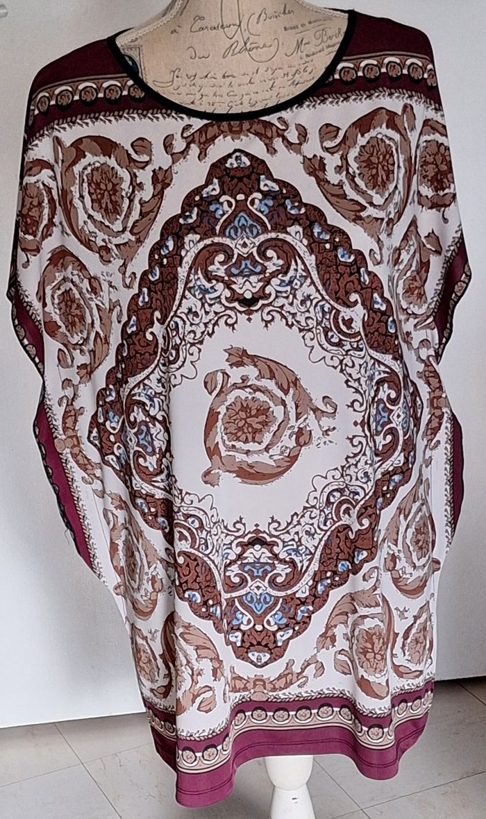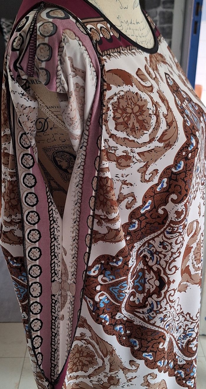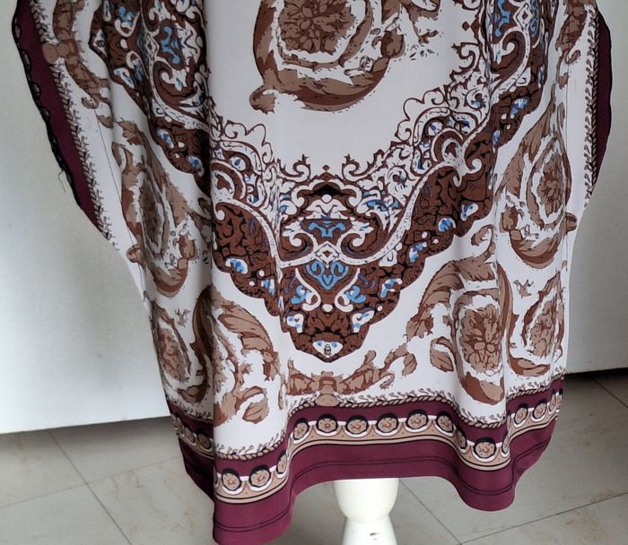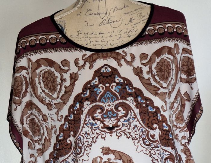 Sans manches avec ouvertures assez larges pour les bras. Petites encoches sur les côtés pour adapter un cordon ou une ceinture. Hauteur 78 cm. Taille L/XL. Petit défaut de couleur à la manche gauche, voir photo, quasi invisible dans les motifs imprimé violet, crème, beige, marron dans un esprit oriental. En polyester et élasthane.