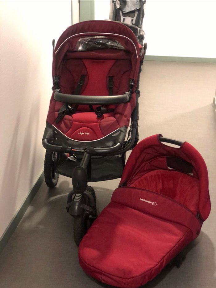 Poussette tout terrain + nacelle + siège-auto 0+ et habillages de pluie poussette et siège auto en très bon état.