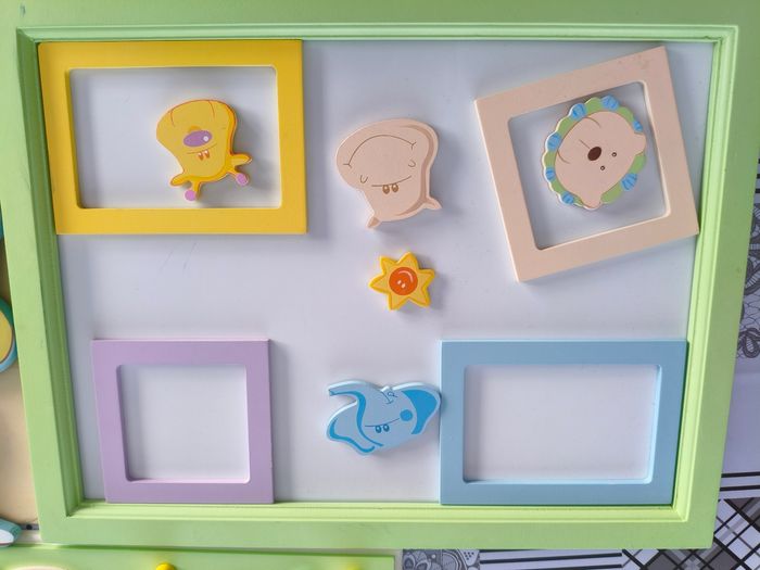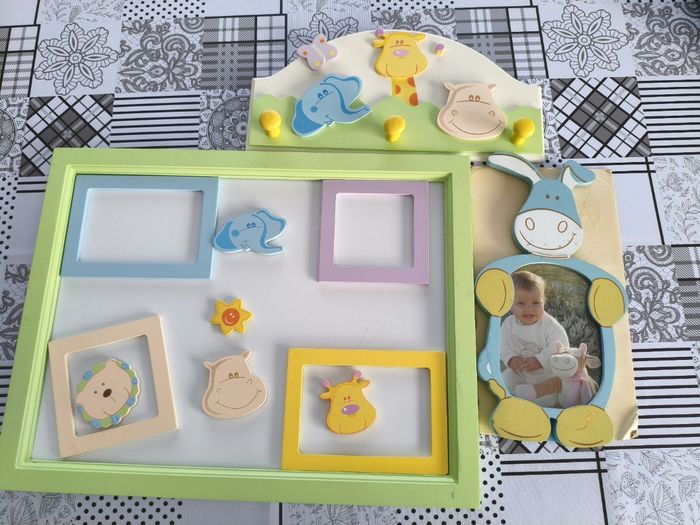 Cadres et porte manteaux mural décoration safari pour chambre d'enfant/ nouveau né. Cadres magnétiques Jamais utilisé. Très bon état malgré quelques défauts d'origine. Et la girafe a perdu son oreille, elle sera a recoller (cassée juste avant la photo 🤬)