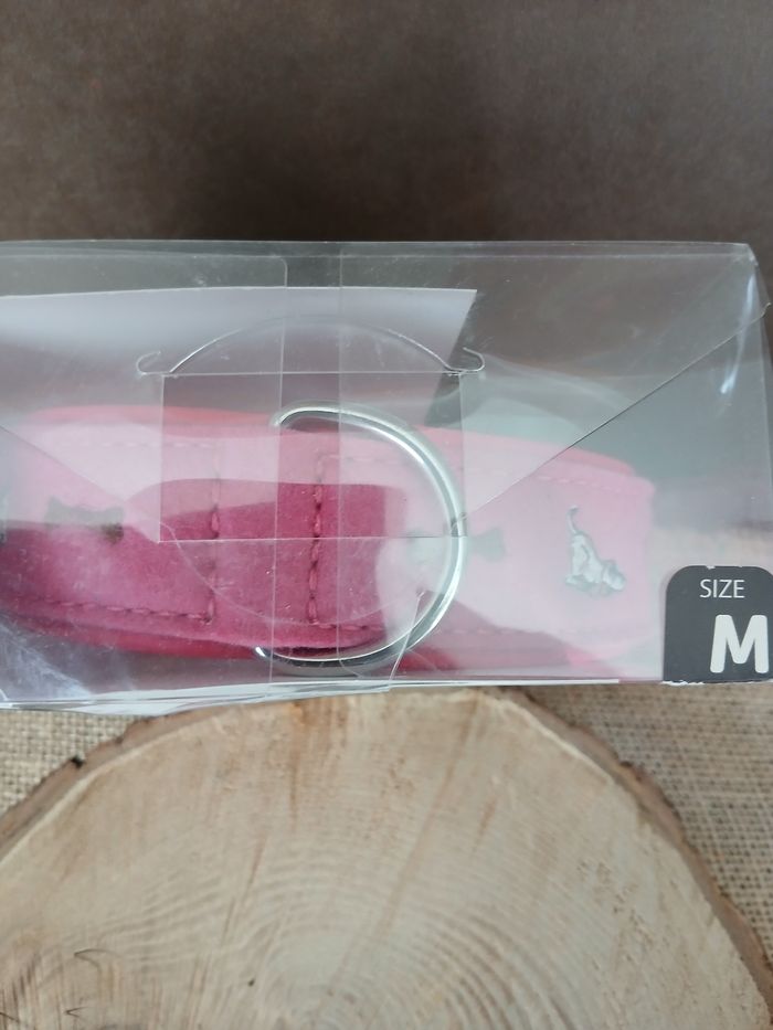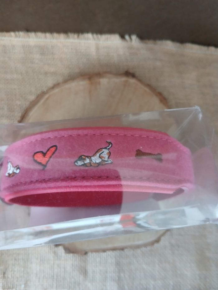 Collier chien taille M cuir rose et feutre brodé coeur. Jamais utilisé Dimension sur l’emballage