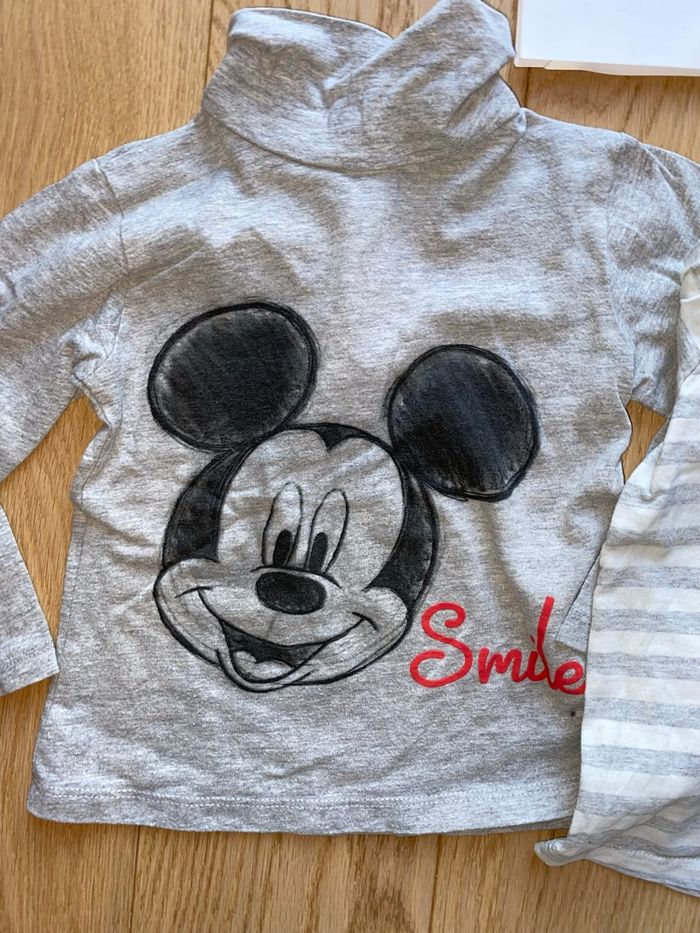 Lot de 2 sous-pulls col roulé – 18 mois 🧵 Lot comprenant : 1 sous-pull gris motif Mickey 🐭 1 sous-pull rayé gris et blanc 📍 État : Très bon état 💬 Chauds, confortables et parfaits sous un pull ou une salopette. 🎁 Réductions automatiques sur les lots activées