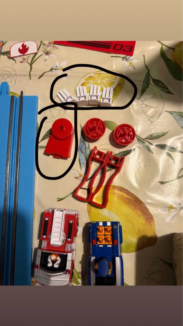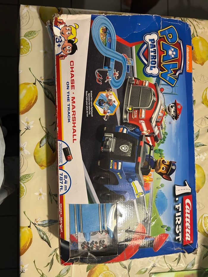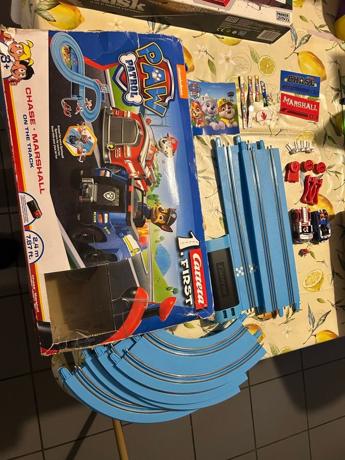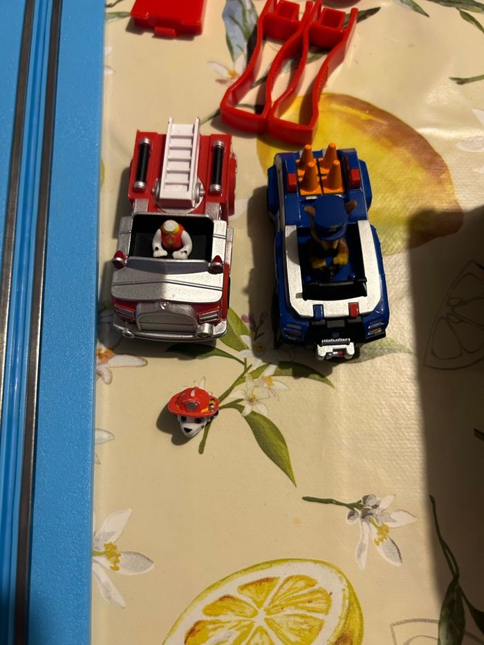 Circuit pat patrouille fonctionne parfaitement la tête d’un bonhomme cassé peu ce recoller et il manque des portes étiquettes deux blanc un rouge voir photo des étiquettes mais ne gêne en rien pour jouet photo