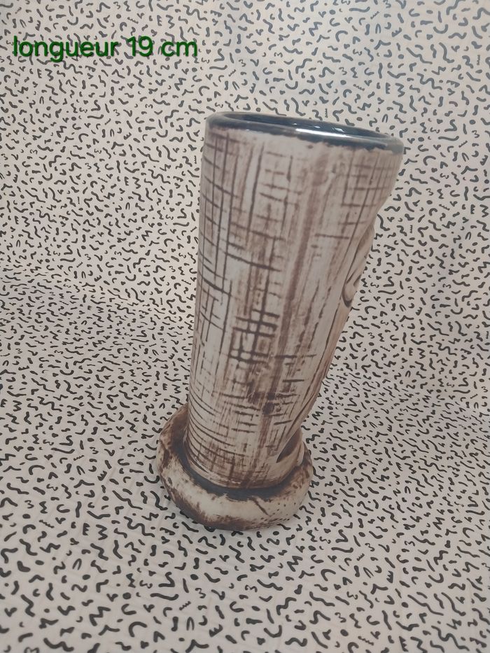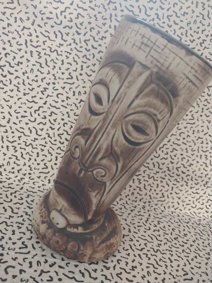 Superbe tiki mug en céramique émaillée, motif visage tribal en relief. Couleurs brun et beige effet bois vieilli, intérieur émaillé foncé. Idéal pour servir vos cocktails exotiques (mai tai, punch, mojito, etc.) ou pour une belle déco de bar. Neuf, jamais utilisé. 📏 Dimensions : Hauteur : 19 cm Diamètre haut : 8 cm Diamètre base : 8,5 cm 🔸 Marquage “Tiki Soul” sous la base 🔸 Parfait pour une ambiance tiki bar, tropicale ou vintage #tikimug #tiki #tikisoul #cocktail #bar