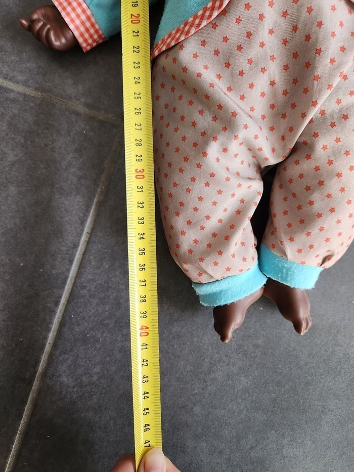 En bon état., quelques bouloches sur les vêtements. Environ 40 cm Parle : maman, bye, bye, hello...vendu sans les piles. Avec un pot et un biberon. Maison non fumeur.