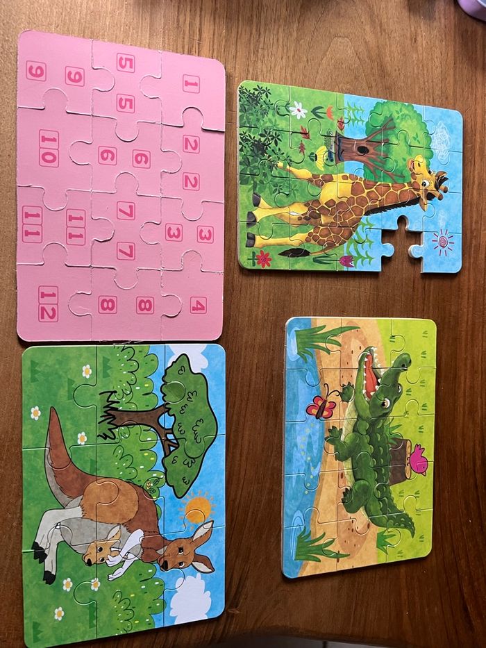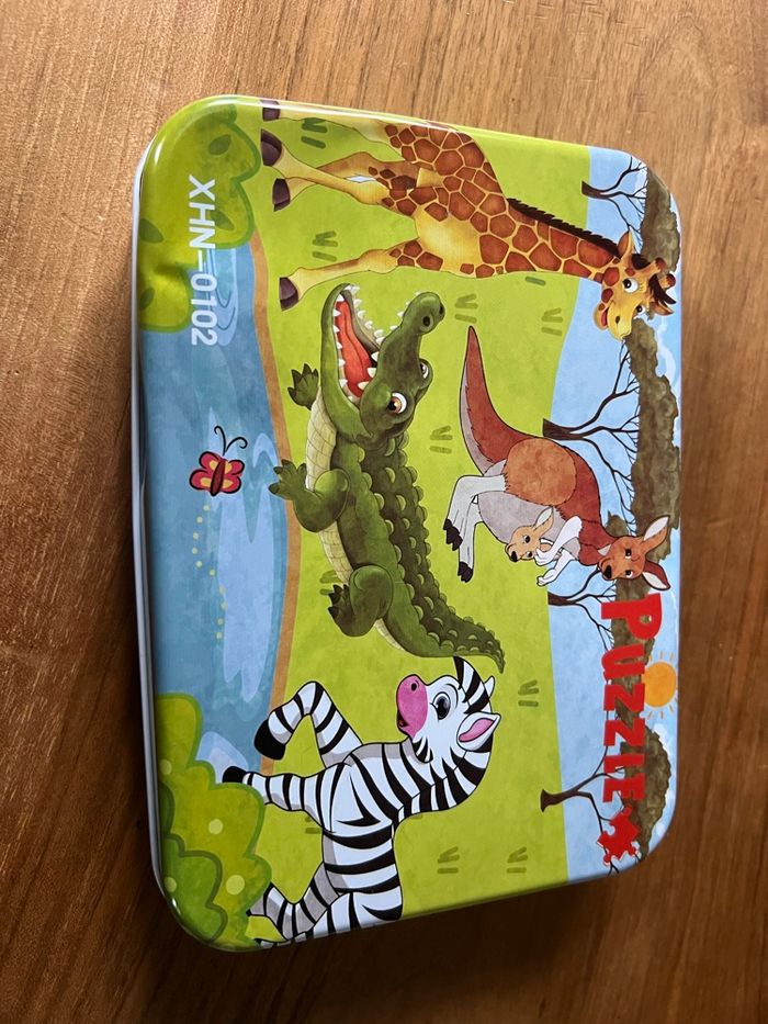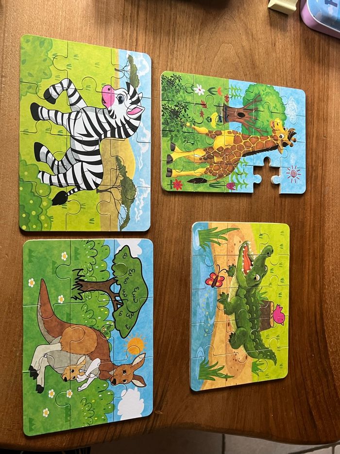 4 puzzles dans une boîte en fer 9/12/15/20 pièces Il manque une pièce sur la girafe. Pièces numérotées au dos