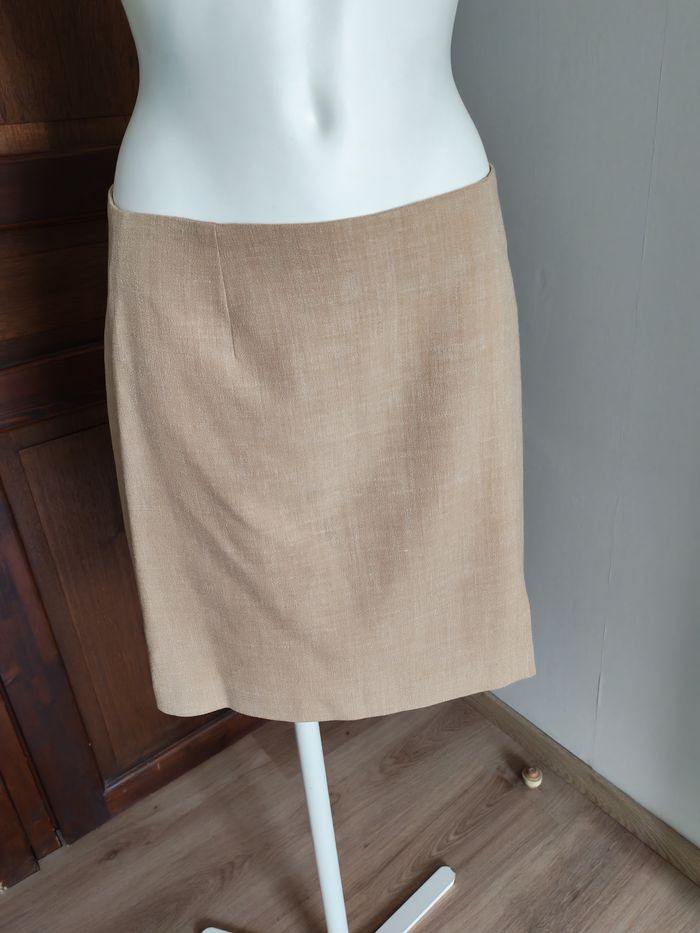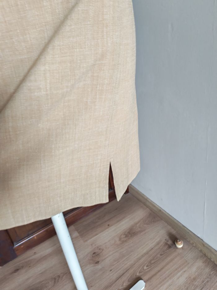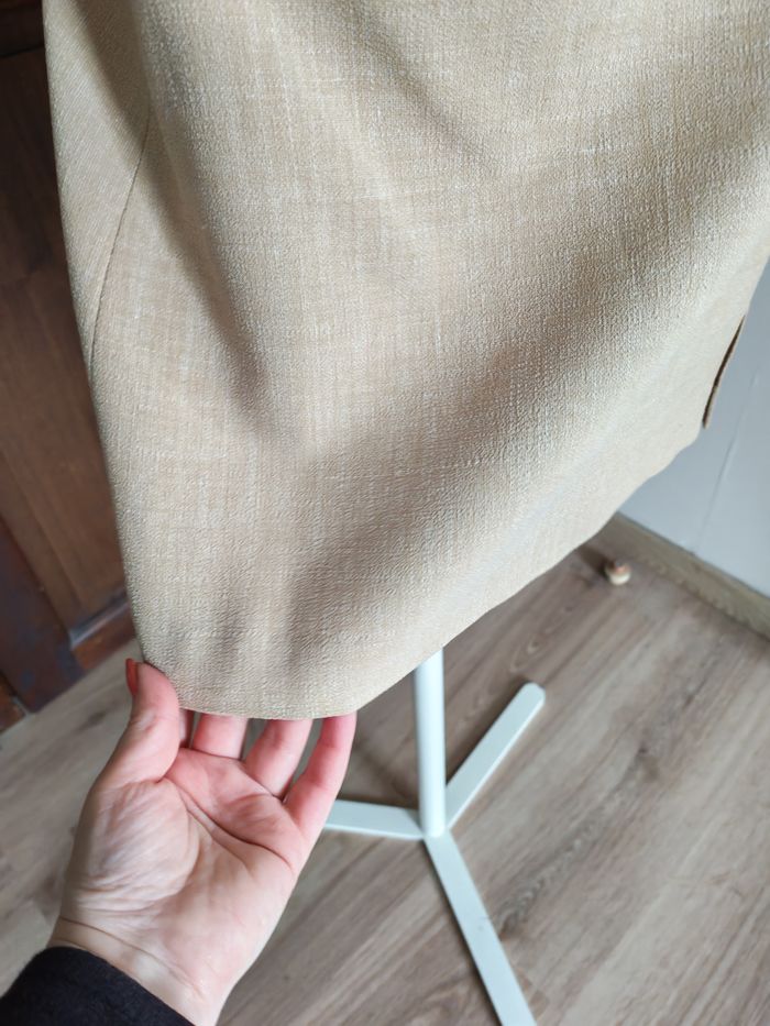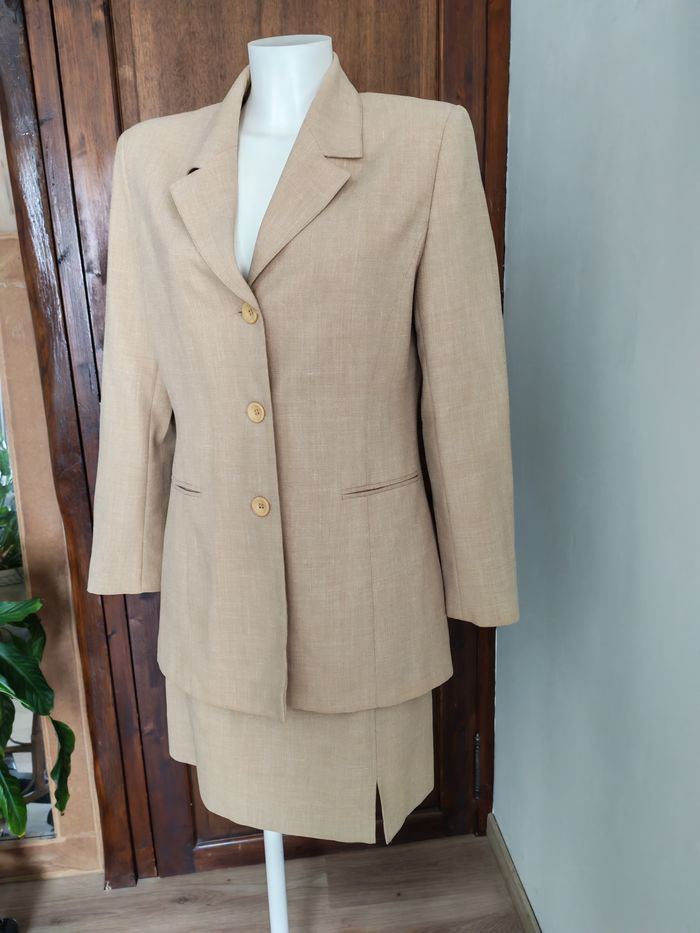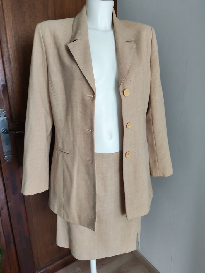 L'ensemble comprend une veste se fermant par 3 boutons, avec les épaulettes et une jupe droite légérement évasée avec une petite fente de 10 cm le long de la cuisse devant sans doublure. Composition : polyester 70%, lin 25%, polyamide 3%, elasthanne 2%, fabriqué au Maroc, pas de taches, ni déchirure, avec les boutons de rechange pour la veste.