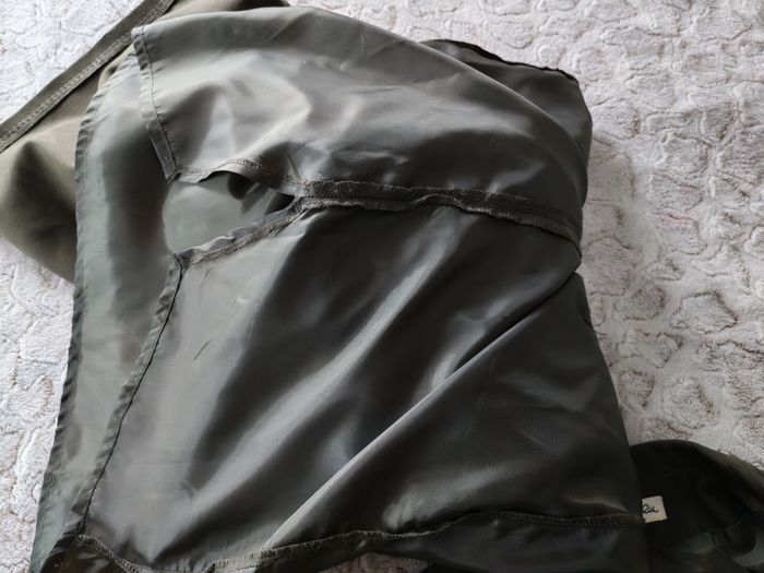 Ensemble veste de tailleur et robe vert kaki taille40 Jacqueline Riu. Ensemble vintage, en bon état général, un peu craqué au niveau de la fermeture éclair sur la doublure à l'intérieur, doublure est fragilisée au niveau des coutures à part ça en très bon état. L'ensemble comprend la robe droite sans manche en bi-couleur : vert kaki uni et vert kaki et gris rayé au niveau de la poitrine, sans manches, taille 38, composition : 65% polyester, 32% viscose, 3% elasthanne, au dos une petite fente; et la veste taille 40 droite à 4 boutons, avec les epaulettes, les manches à revers, composition identique à la robe, en très bon état, le haut est vert kaki, le bas est ert kaki et gris rayé. *Mannequin fait la taille 36. Mesures veste : Longueur veste : 61 cm Longueur manche depuis l'aisselle : 38 cm et 42 cm sans revers Longueur manche depuis l'épaule : 56 cm et 60 cm sans revers Largeur dos épaules : 43 cm Largeur dos aisselles : 52 cm Largeur taille : 47 cm Largeur hanches : 50 cm Mesures robe : Longueur : 90 cm Longueur de la fente : 12 cm Largeur dos entre les aisselles : 46 cm Largeur taille : 41 cm Largeur hanches : 50 cm Poids de l'ensemble : 755g