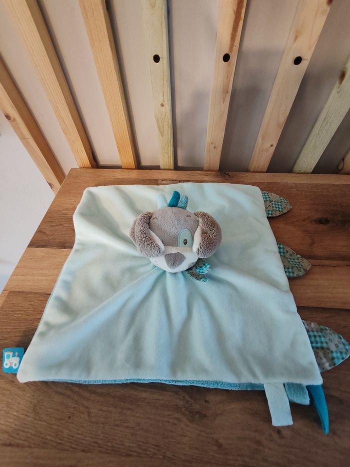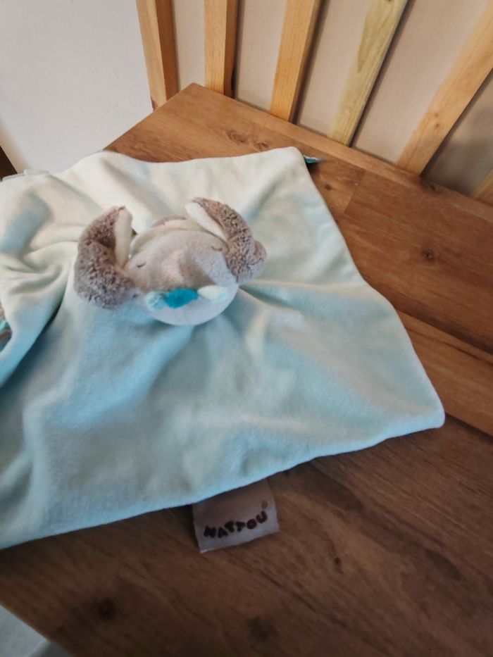 Doudou plat chien NATTOU Gaston et Cyril bleu train 26 cm environ Tbe Étiquette marque présente 18 euros Envoi en relais