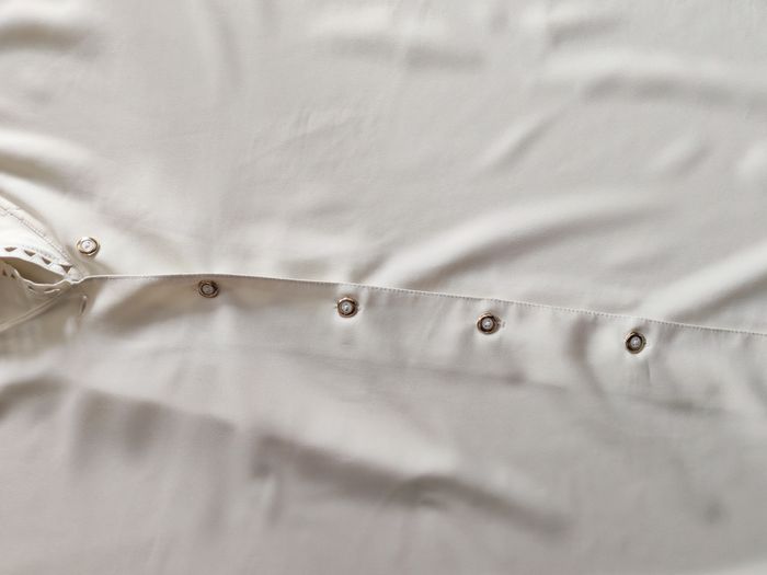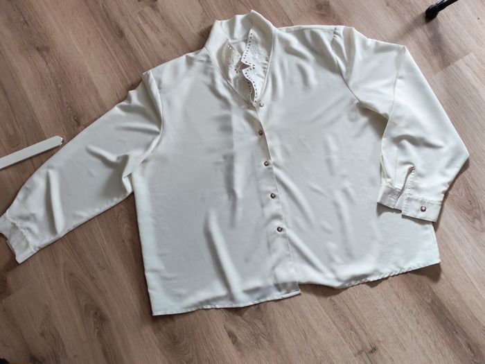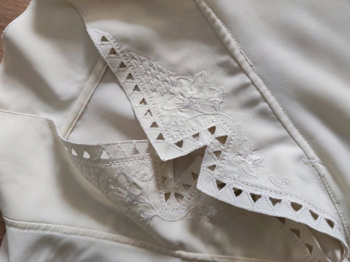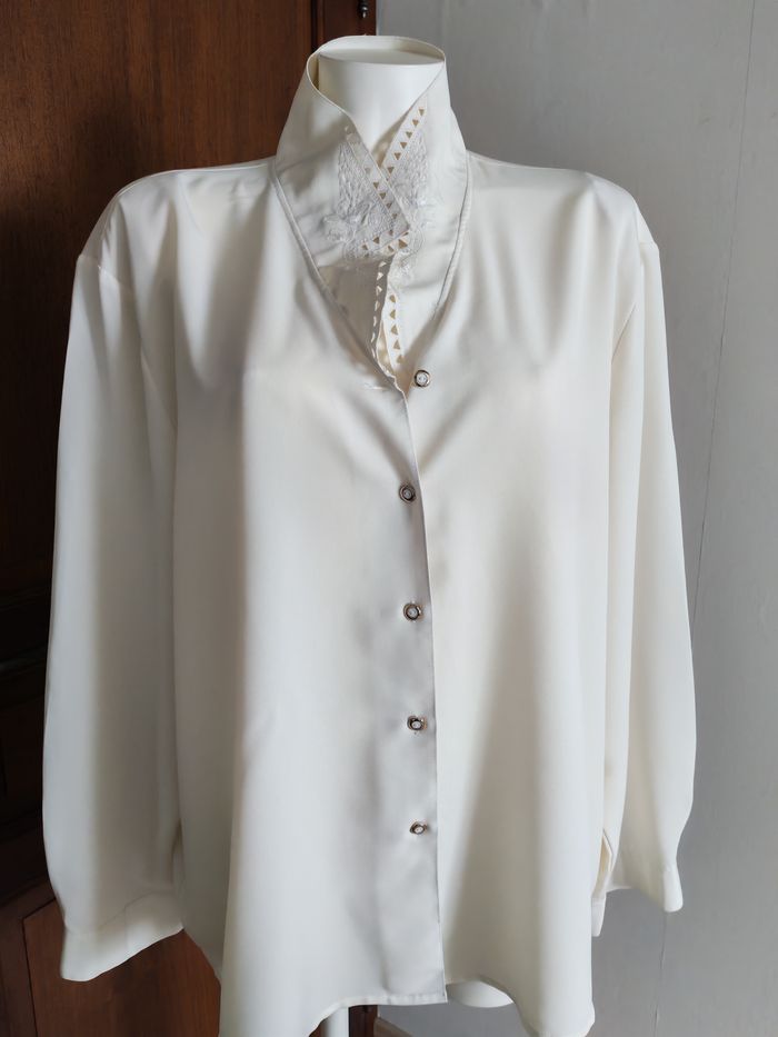 Blouse blanc écru grande taille brodée sur le col, avec les épaulettes très fines, manches longues, vintage, n bon état énéral, au niveau du col à l'intérieur une sorte de poussière, je pense que c'est la matière rigide qui était entrecollé et qui s'est décomposée avec le temps, visible uniquement si on met contre lumière le col, couleur blanc écru, taille 50 ou autre, je ne suis pas sûre car aucune étiquette n'est présente, voir les mesures ci-dessous. Matière fluide, synthétique, mais agréable. Mesures : Longueur chemise : 72 cm Longueur manche depuis aisselle : 48 cm Longueur manche depuis l'épaule : 65cm Largeur dos entre les aisselles : 53 cm Largeur dos entre les épaules : 75 cm Largeur manche : 25 cm Poids : 260g *Mannequin fait la taille 36