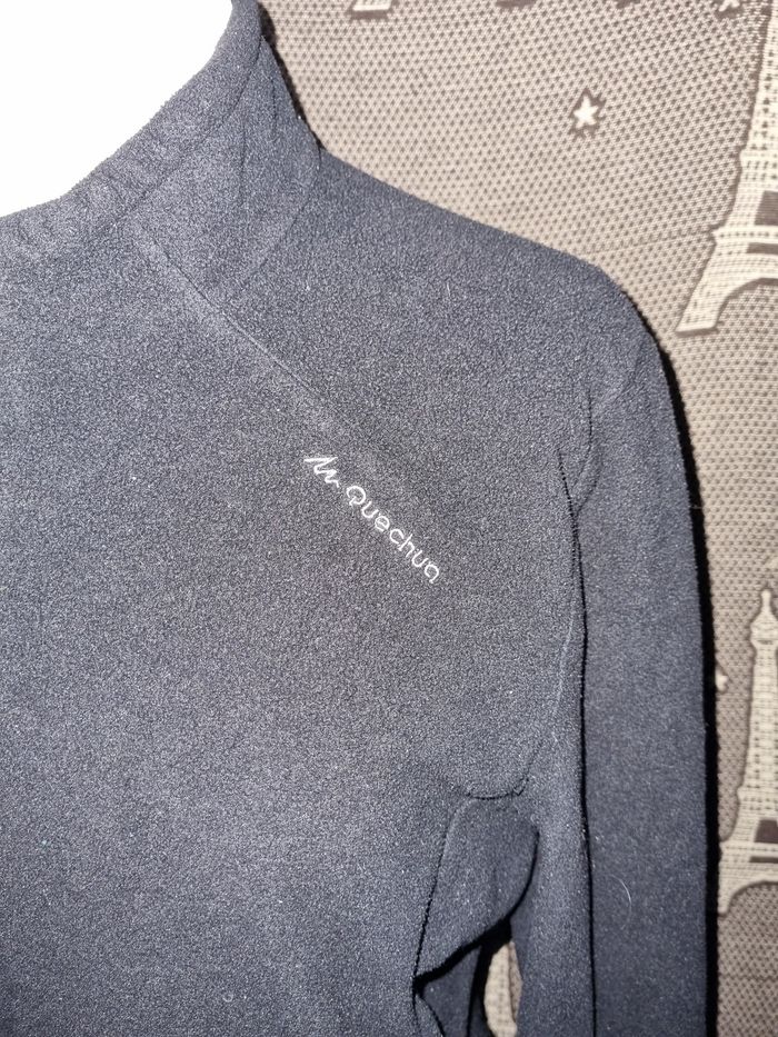 Gilet zippé noir polaire, taille M marque Quechua, 2 poches zippée, longueur 68cm, largeur 51cm, longueur épaule à aisselle 26cm, largeur aisselle à aisselle 53cm, longueur manche 51cm.