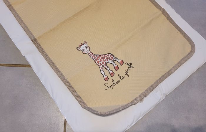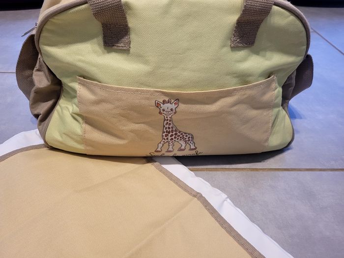Sac à langer muni de plusieurs poches, avec petit matelas a langer, dans les tons vert pâle et beige, de la marque Sophie la Girafe, en très bon état, juste les coins qui sont légèrement abîmés. Article lavé pour la vente.