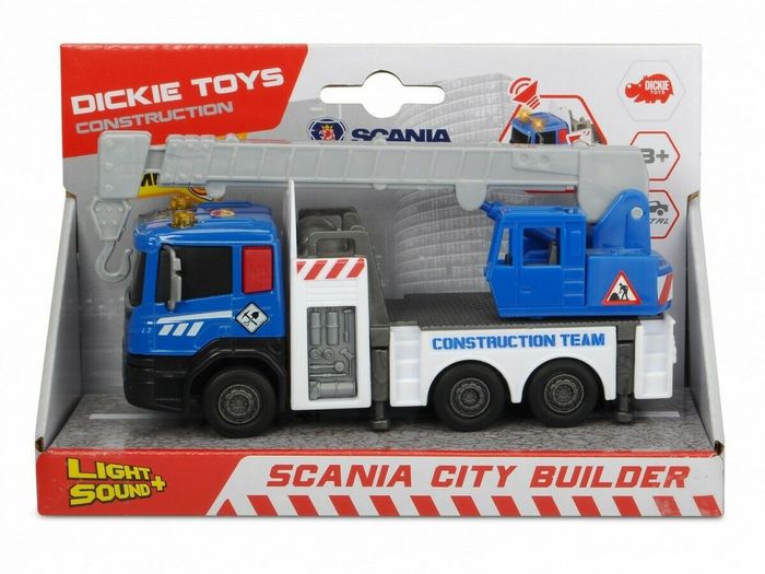 SCANIA camion de construction avec lumière et son 16 cm 05861 Echelle monte et descend, tourne, se déplie ! Fonctionne avec 3 piles 1.5V LR41 Produit neuf dans son emballage d'origine non ouvert NE CONVIENT PAS AUX ENFANTS DE MOINS DE 3 ANS !!