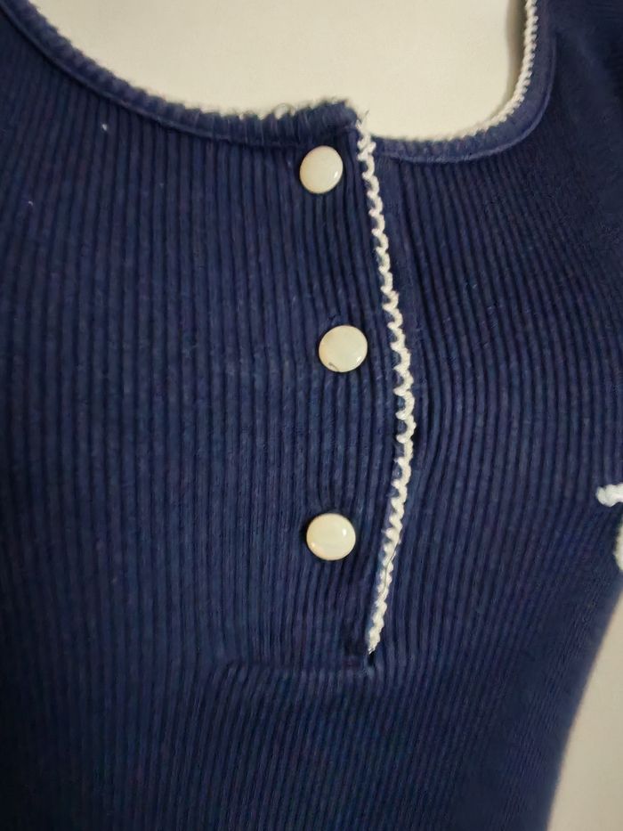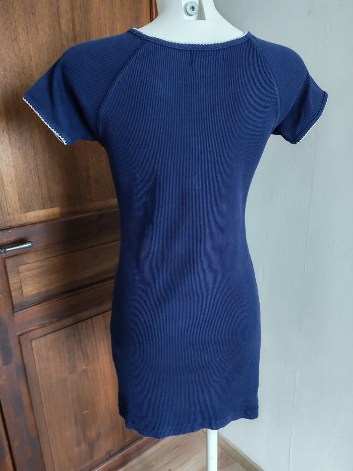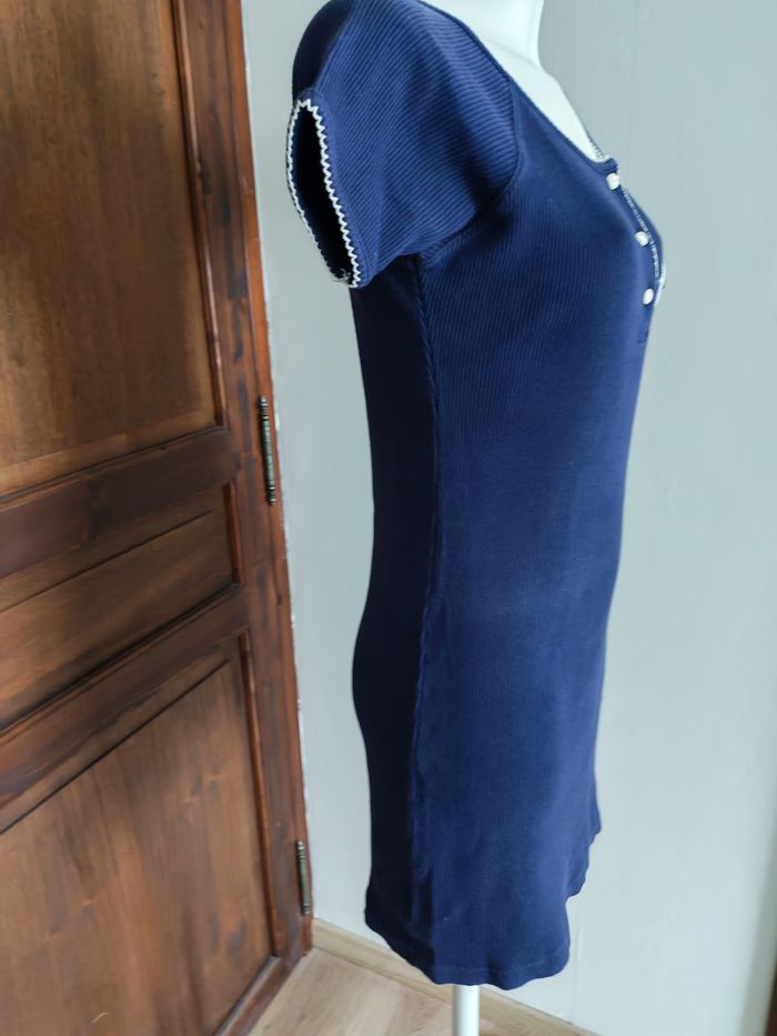 Robe bleu marine en coton René Derhy taille S. C'est une robe ou chemise de nuit avec une petite décoration marine de coquillage et corde sur la poitrine avec 3 boutons blancs nacrés devant, manches courtes raglan, en 100% coton, légérement étirable, agréable au toucher, belle qualité, en très bon état général, la couleur est un peu dépassée et au dos quelques traces blanches. *Mannequin fait la taille 36 Mesures : Longueur : 80 cm Largeur dos entre les aisselles : 43 cm Largeur épaules : 34 cm Largeur taille : 40 cm Poids : 285g