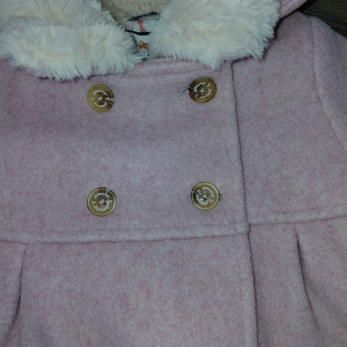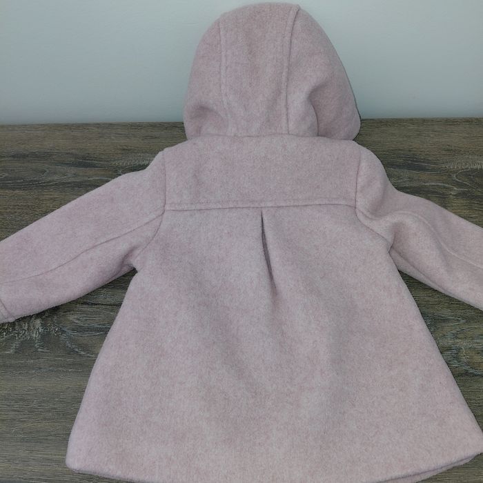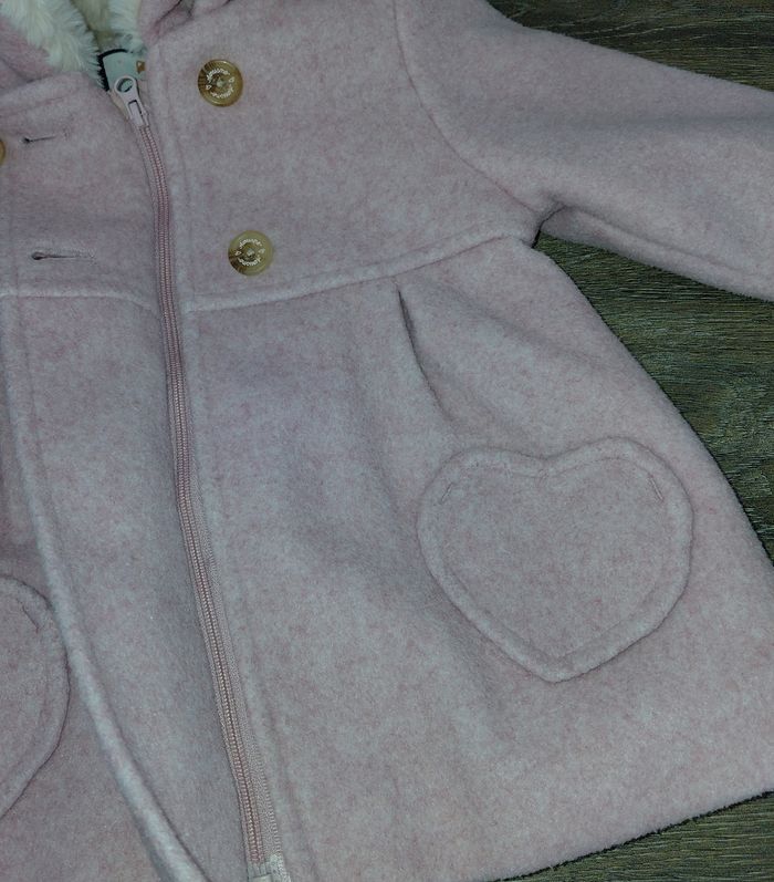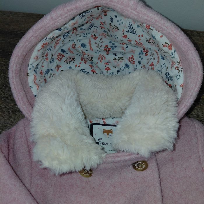 C&A Taille 74 cm Manteau à capuche en matière lainage 100% polyester rose doublé polaire Col fourrure Jolis détails Ferme par zip + boutons Excellent état