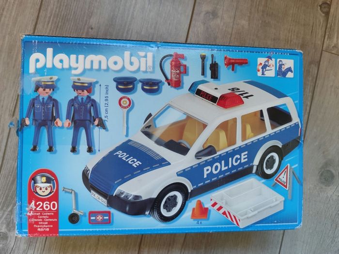 Vend cette boîte voiture de patrouille police playmobil Très bon état Complet Remise en main propre ou frais de port a charge de l'acheteur