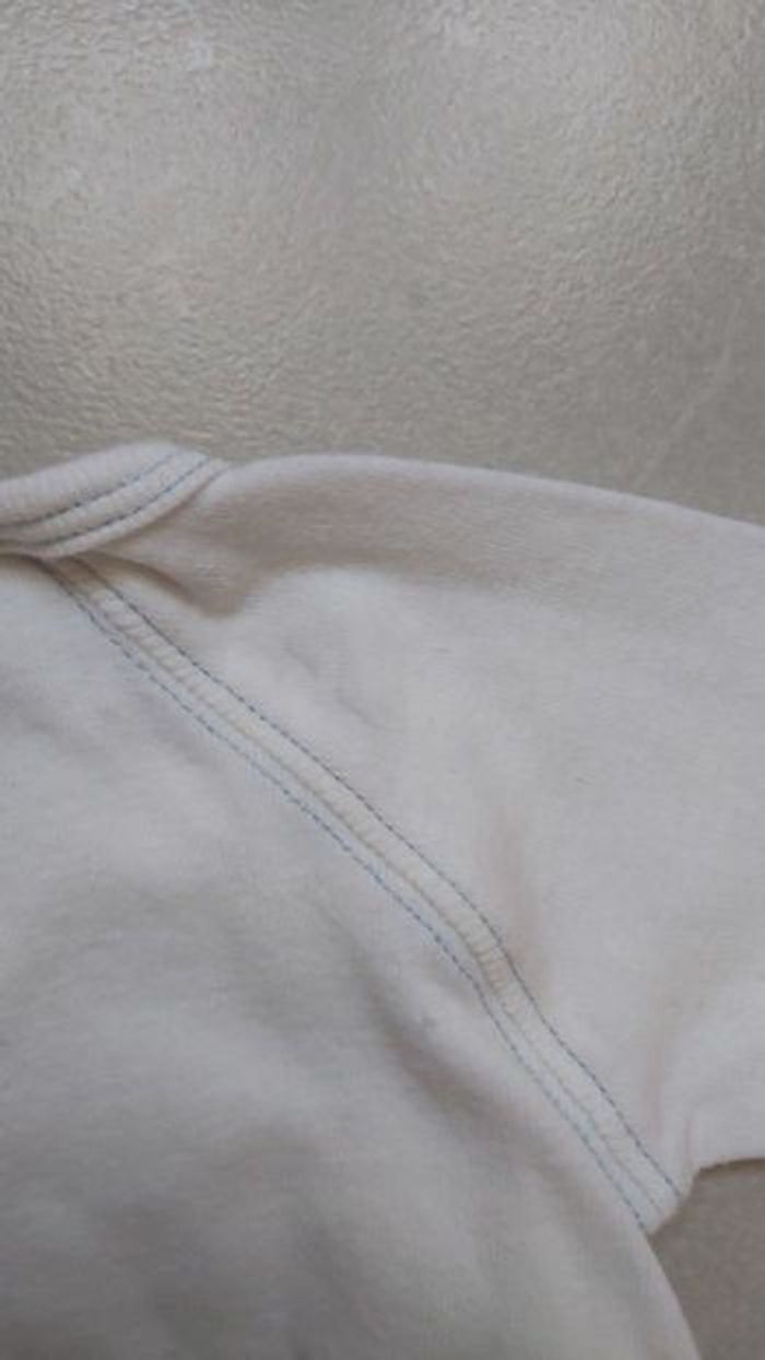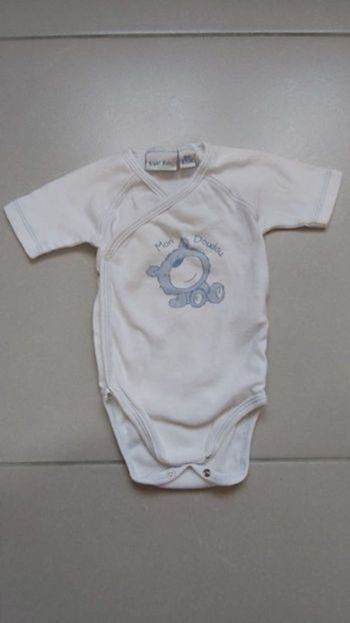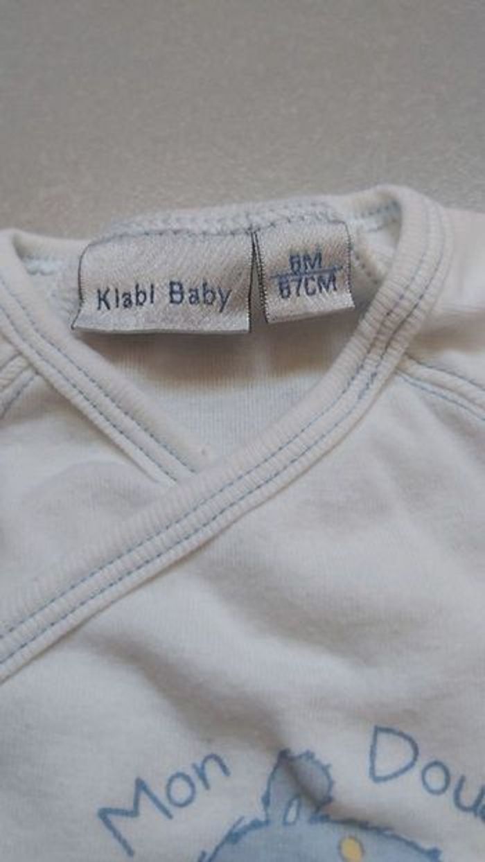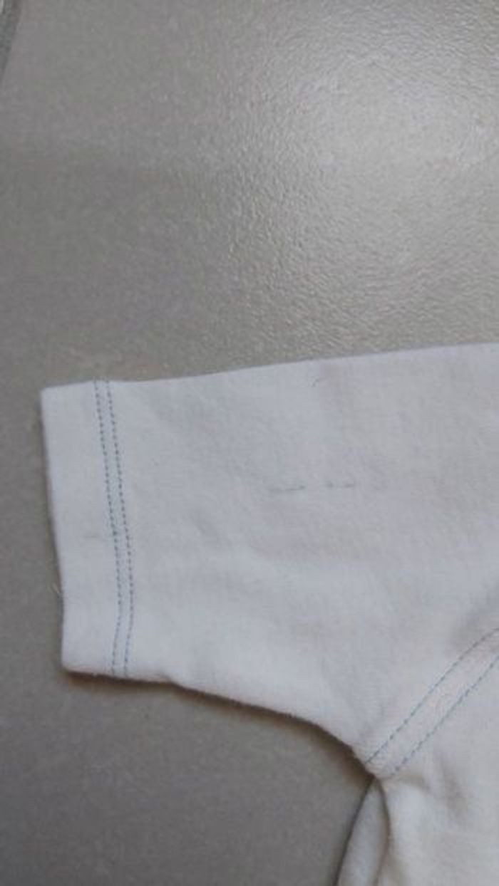 Bodie manche courte Taille 6 mois 2 traits sur le dos voir photo Marque kiabi Couleur blanc et bleu