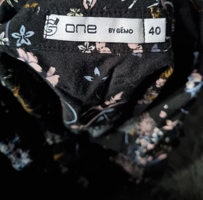 Chemise noir à motifs style japonais, fermeture boutons, taille 40 marque Gémo, longueur 55cm, largeur 46cm, longueur épaule à aisselle 19cm, largeur aisselle à aisselle 48cm, longueur manche 48cm.