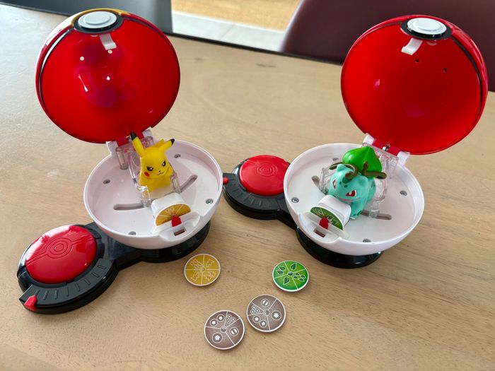 La Poké Ball attaque surprise est un jeu de hasard pour affronter en duel 2 Pokémon, sans écran, en forme de Poké Ball. Un concept de jeu, proche du célèbre "pierre, feuille, ciseaux" mais en version Pokémon Idéal pour tous les fans de Pokémon, ce jeu permet de s'affronter en duel et de simuler les combats Pokémon de la saga Pour jouer, c'est facile : appuyez sur le bouton à l'arrière de la Poké Ball sur le socle pour lancer virtuellement une attaque. Le Pokémon qui aura envoyé l'attaque la plus puissante remportera la manche. Un jeu de hasard qui fait drôlement penser au pierre, feuille, ciseaux 3 disques d'attaques disponibles pour chaque Poké Ball.
