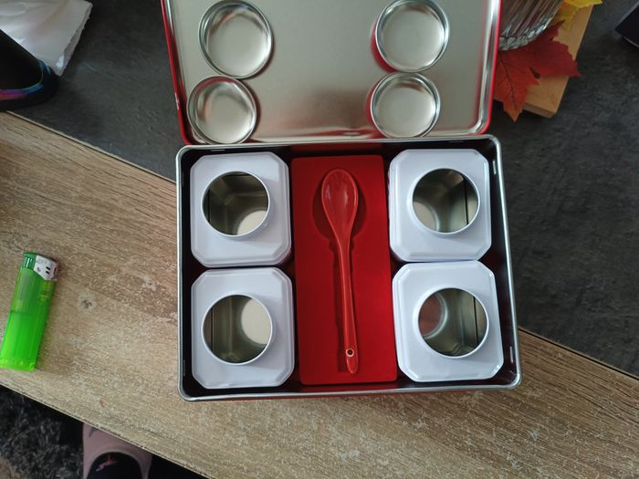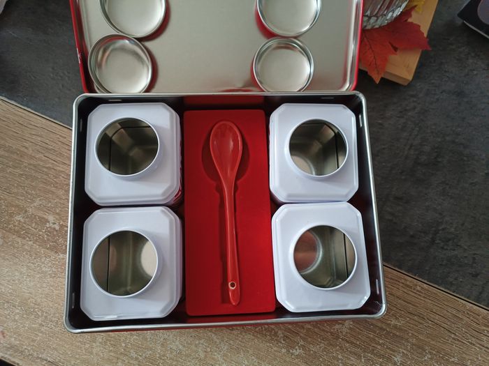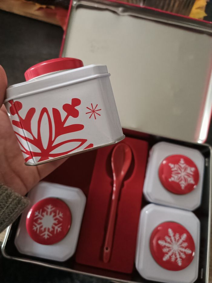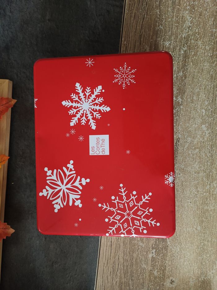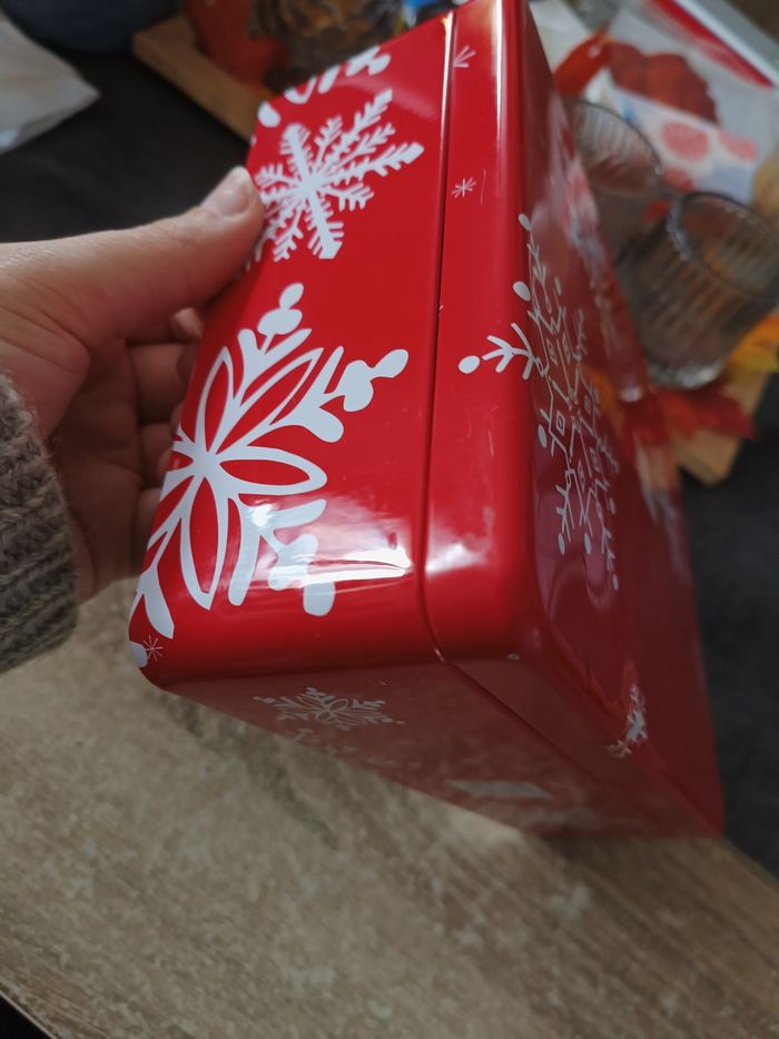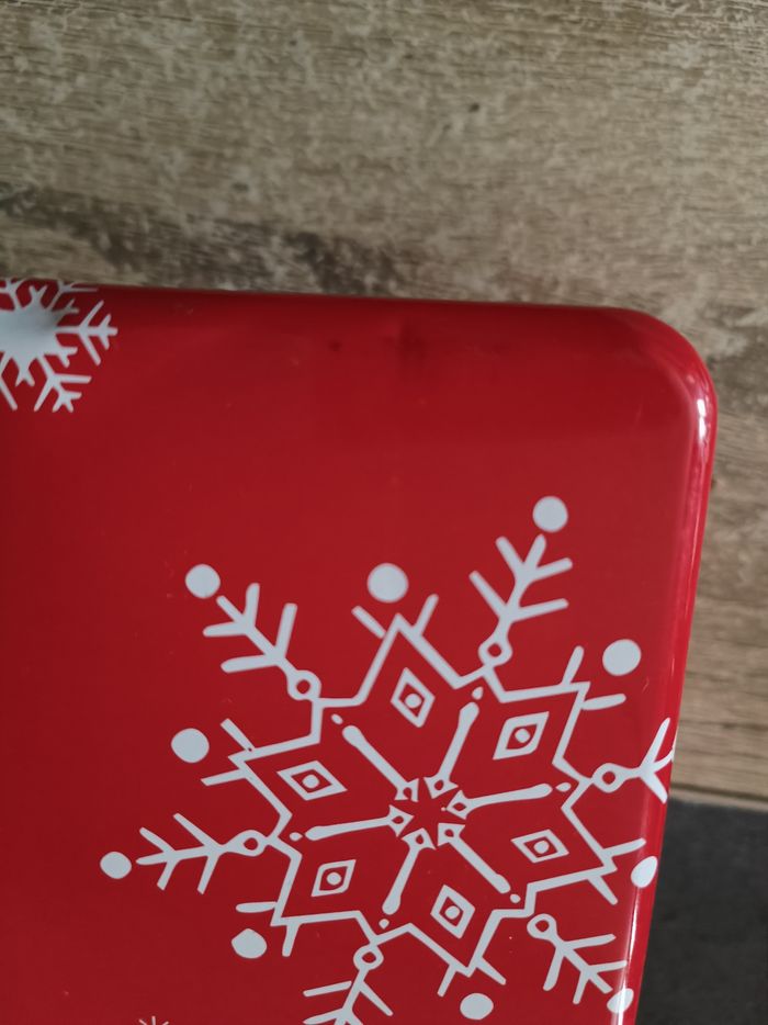 Jolie boite métallique petites imperfections visibles en photos, motif flocons de neige