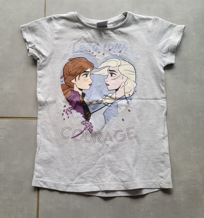 T-shirt manches courtes, de couleur gris avec motifs Reine des Neiges, de la marque Disney, taille 6 ans (110-116 ans), en très bon état. Article lavé pour la vente. #6anslae72