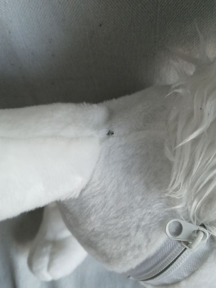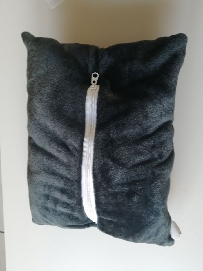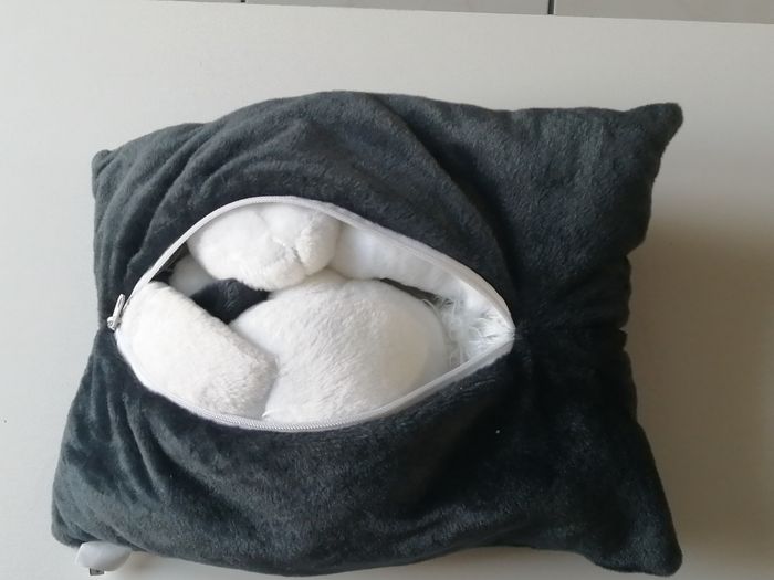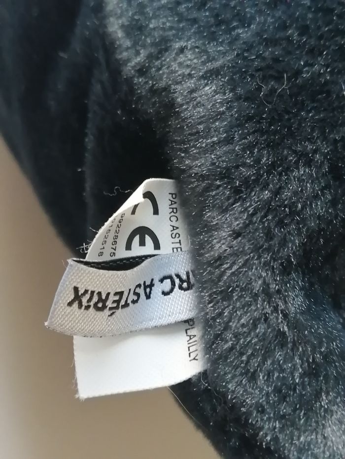 coussin aspect velours noir fermeture au dos qui renferme une grande peluche idefix le coussin mesure 35cmx28cm la peluche 55 cm parc astérix goscinny-uderzo 2013 tout petit trou au niveau d'une couture à peine visible à voir sur dernière photo
