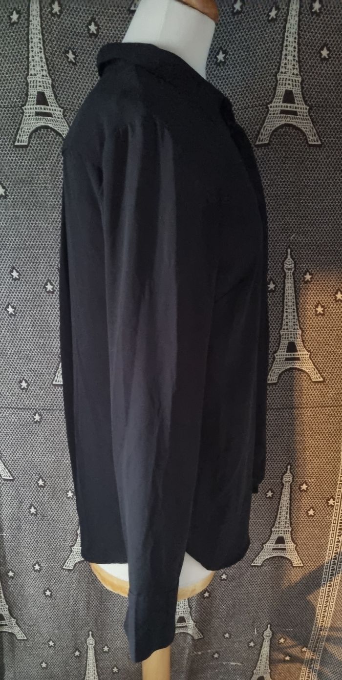 Chemise uni noir à manches longues, fermeture boutons, une poche, taille M marque Kiabi, longueur 60cm,largeur 49cm, longueur épaule à aisselle 21cm, largeur aisselle à aisselle 50cm, longueur manche 48cm.