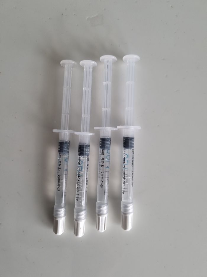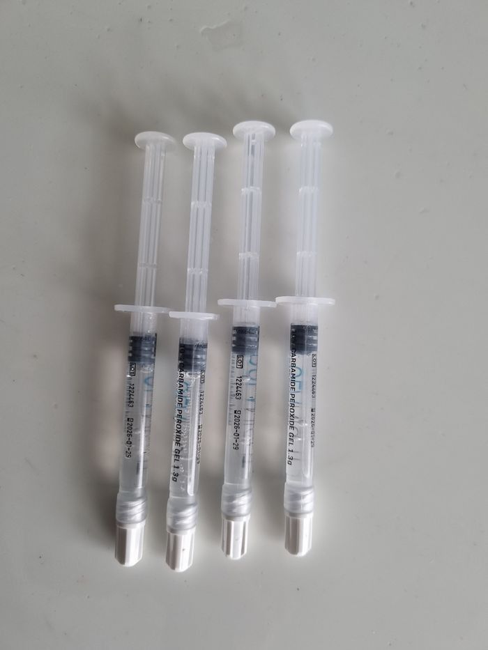 4 seringues , gel de blanchiment dentaire. Achetées chez le dentiste Dents blanches assurées Idéal pour les personnes qui ont les gouttières. Il y a juste le produit à mettre dedans. Gel à base de peroxyde de carbamide 10% Ultra efficace .