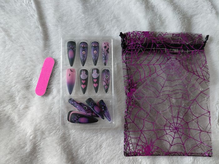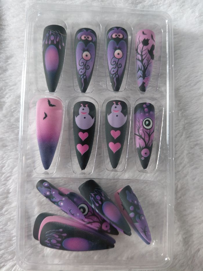 Ensemble de Faux ongles pour Halloween 24 pieces Violet, Rose et Noir avec son côté brillant Longs couvrants Design Gothiques avec découpes en forme de Cœur, Chauves-souris, Sorcières, Yeux, et toiles araignées Amovibles pour Manucures Élégantes Spécial Halloween Nail Art Durable
