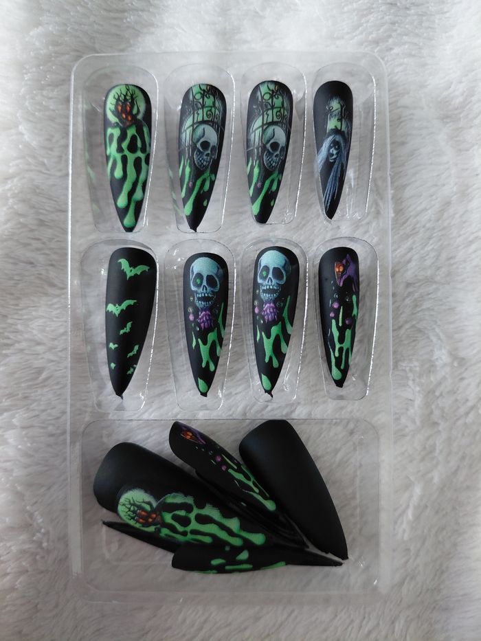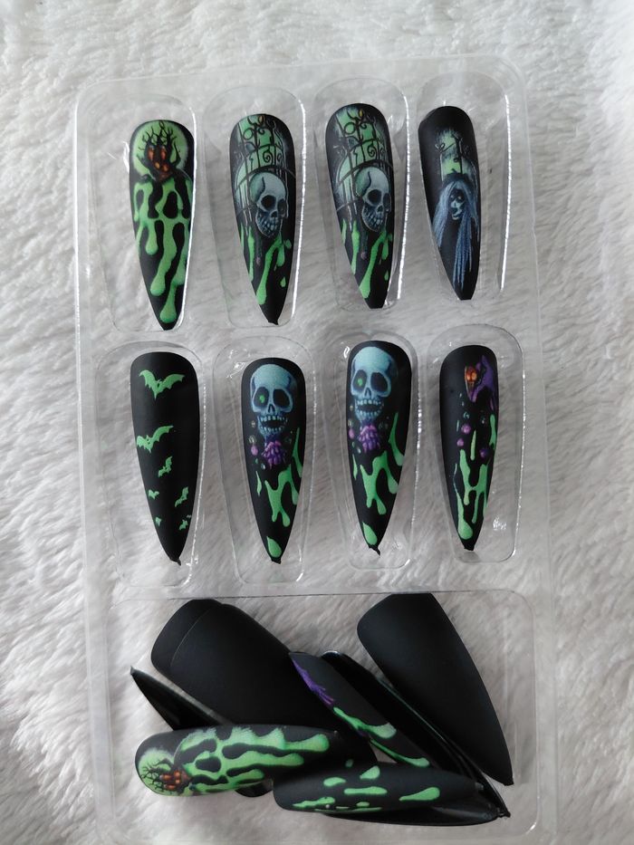 Ensemble de Faux ongles 22 pieces Couleur : Noir Vert Design Crâne Chat Sorcière Chauve-souris Amovibles pour Manucures Élégantes Nail Art Durable