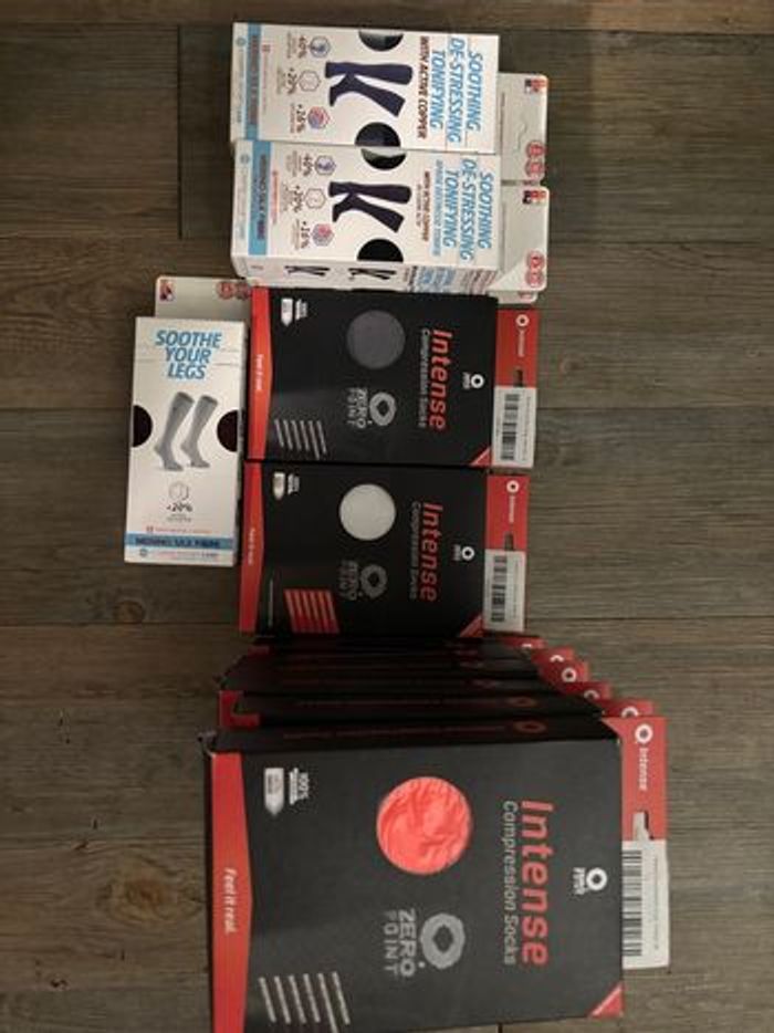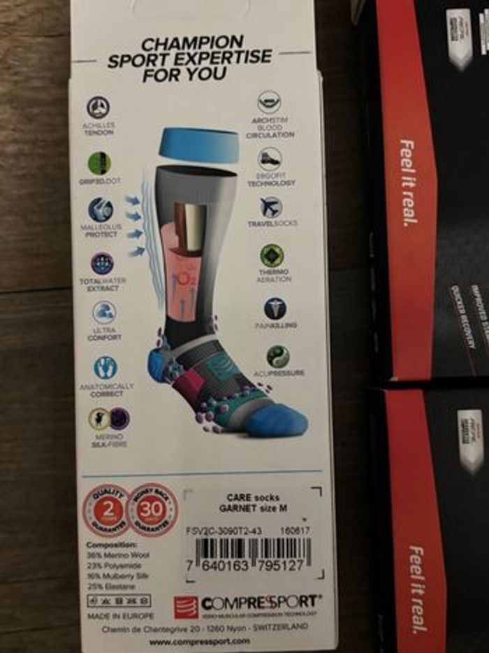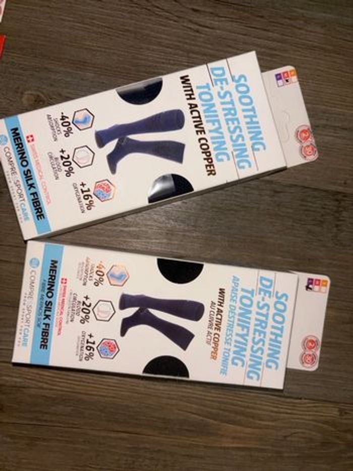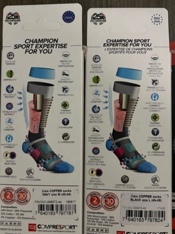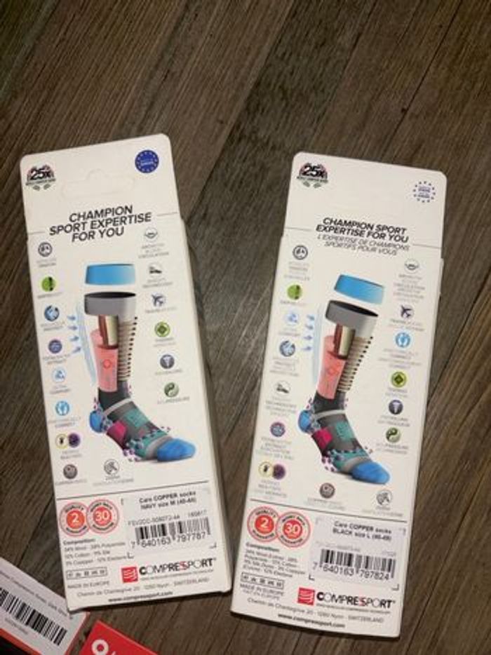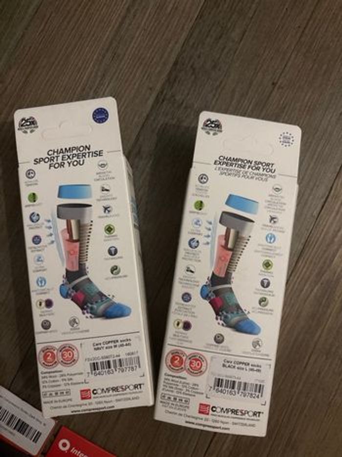 Chaussettes de compression techniques Compressport Care Copper, neuves dans leurs emballages d’origine.