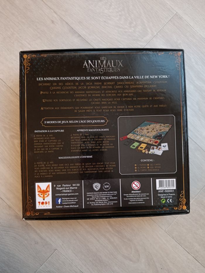 Les Animaux Fantastiques, un jeu de société familial d'aventure et de collection pour les fans de la saga. Les animaux fantastiques se sont échappés dans la ville de New York ! Utilisez vos sortilèges et récupérez les objets magiques pour capturer un maximum de créatures cachées dans la ville. 3 modes de jeux selon l’âge des joueurs À partir de 4 ans : Initiation à la capture À partir de 7 ans : Apprenti magizoologiste À partir de 12 ans : Magizoologiste confirmé Très bon état, le jeu est complet et n'a été que peu utilisé. Un jeu idéal pour les fans de la saga ! N'hésitez pas à me contacter pour plus d'informations ou d'envois de photos supplémentaires. Possibilité de remise en main propres sur Paris.