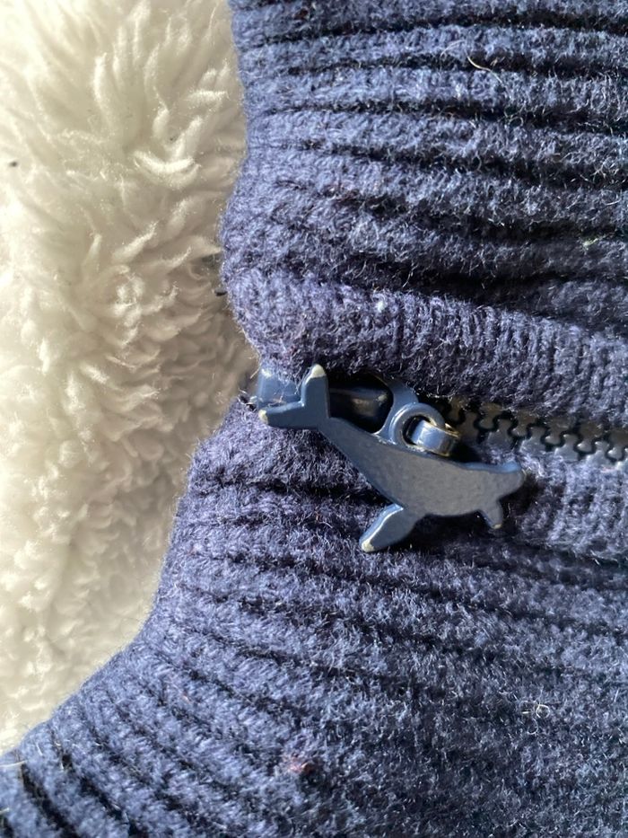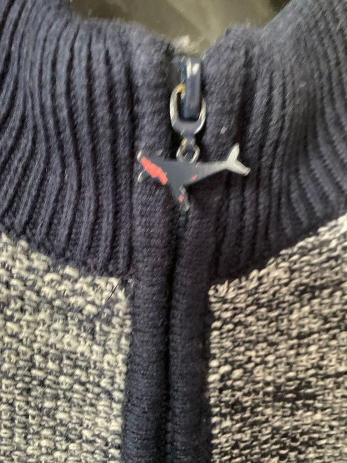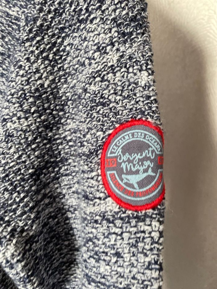 Beau gilet bien chaud le calme des océans marin en très bon état, seul le poisson sur la fermeture a quelques éclats, voir les photos. 59% coton 30% polyamide 11% laine et 100% polyester Taille 9 ans 134 cm Sergent Major