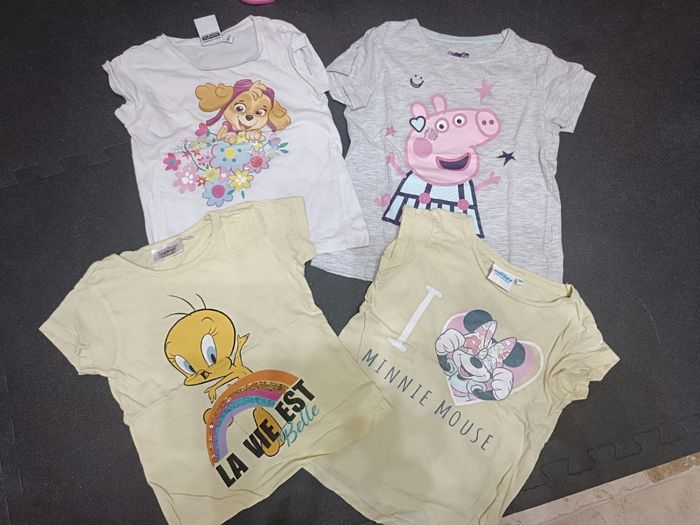 Je vends ce lot de 4 tee-shirts manches courtes pour fille de 3 ans. - Type de produit : Lot de tee-shirts manches courtes - Taille : 3 ans / 98 cm - Univers : Fille - Couleurs : Multicolore - Personnages : Paw Patrol, Peppa Pig, Titi, Minnie Mouse N'hésitez pas à me contacter, j'ai plusieurs autres annonces de vêtements filles.
