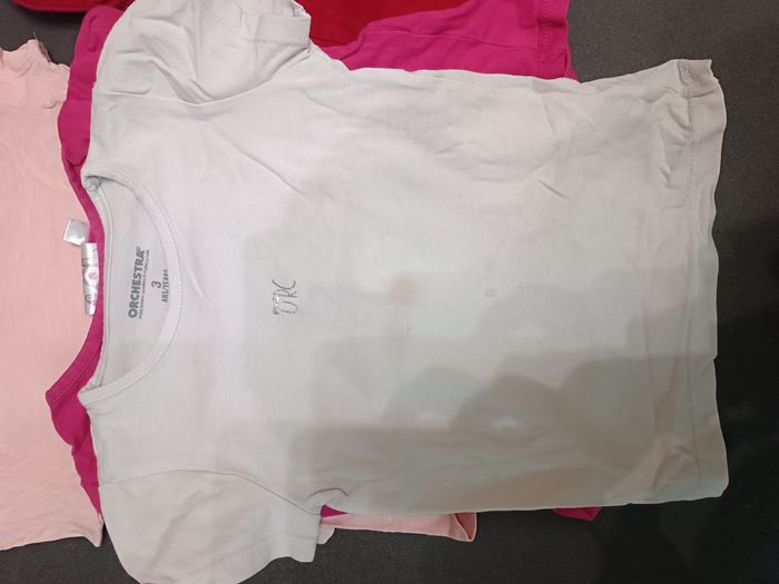 Je vends ce lot de 7 tee-shirts manches courtes pour fille de 3 ans de diverses marques - Type de produit : Tee-shirt - Univers : Enfant - Marque : Orchestra, terre de marin, la halle, LOL. - Taille : 3 ans / 98 cm - Couleur : Multicolore - Caractéristiques : Manches courtes Je rajoute 1 huitième tee shirt qui présente une petite tâche au milieu devant (voir 2ème photo) N'hésitez pas à me contacter pour plus d'informations, j'ai également plusieurs autres annonces de vêtements fille