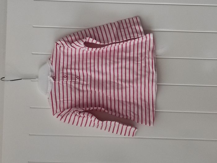 "Description : Adorable T-shirt à manches longues pour bébé fille, taille 12 mois. Matière : 100% coton, doux et confortable Motif : rayures blanches et roses Détails pratiques : 3 pressions au dos pour un enfilage facile Idéal pour la mi-saison ou à glisser sous une petite veste. État : Très bon état
