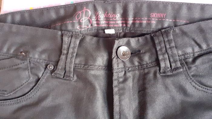 Vends un jean 60 % coton, 38 % polyester, 2 % élasthanne, fermetures éclair au bas des jambes, couleur noir uni avec effet glacé, marque B. Lighting, taille 29 (US). Correspond à une taille 38. Tour de taille 78 cm. Longueur entrejambe : 79 cm.