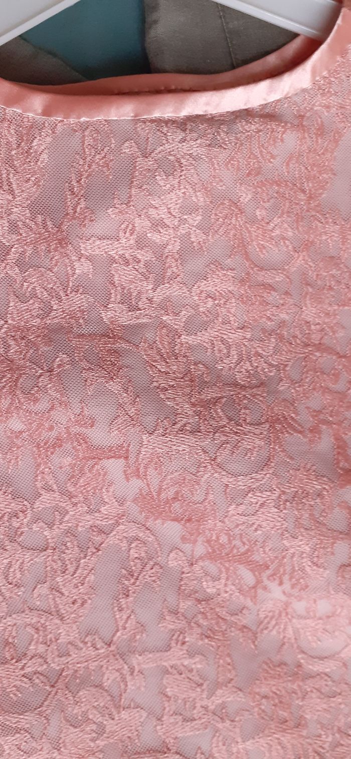 Vends un top manches longues en dentelle polyester, doublé sauf sur les manches, fermeture éclair sur un côté, couleur rose/orange, taille 40. Longueur dans le dos : 49 cm Largeur aisselle à aisselle : 47 cm.