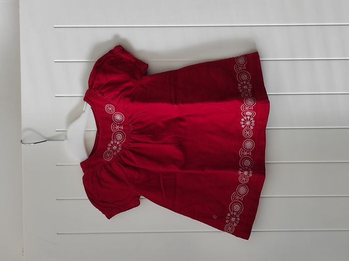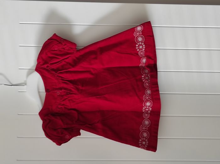Robe en velours doux doublée coton, idéale pour bébé fille de 12 mois. Fermeture : 3 boutons dans le haut du dos pour faciliter l’habillage Manches : petits manchons avec bouton Motifs : broderies délicates au col et en bas de la robe Coloris : rouge État : très bon état, soigneusement entretenue Parfaite pour les occasions spéciales ou les jolies sorties ! 🌸