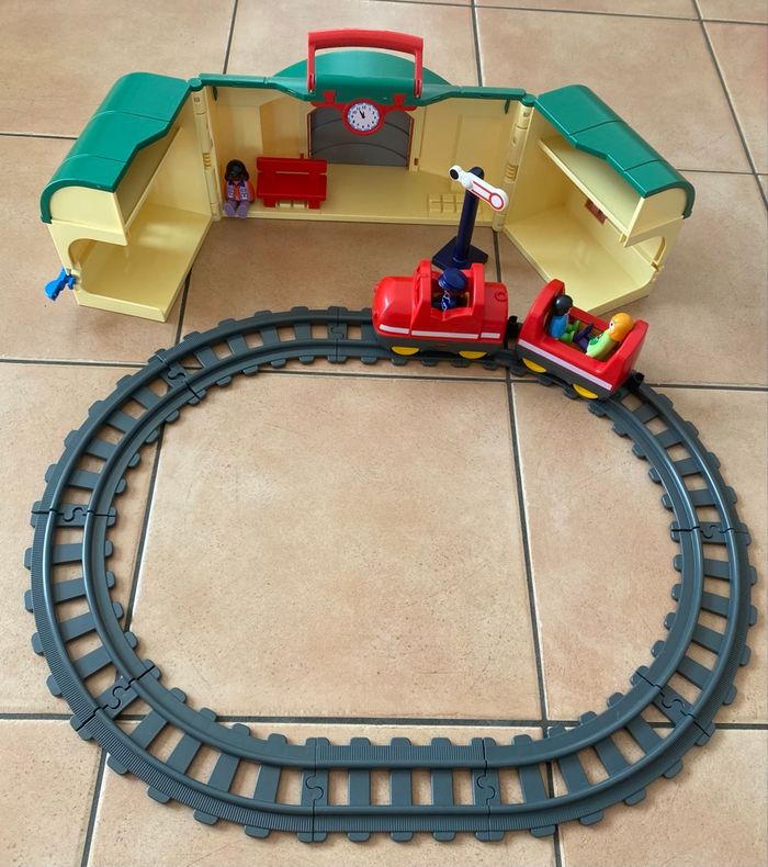 Gare transportable Playmobil 123 Modèle 6783 Manque un élément de décor mais ajout d’une figurine pour combler. Vous achetez ce que vous voyez sur les photos Playmobil 123