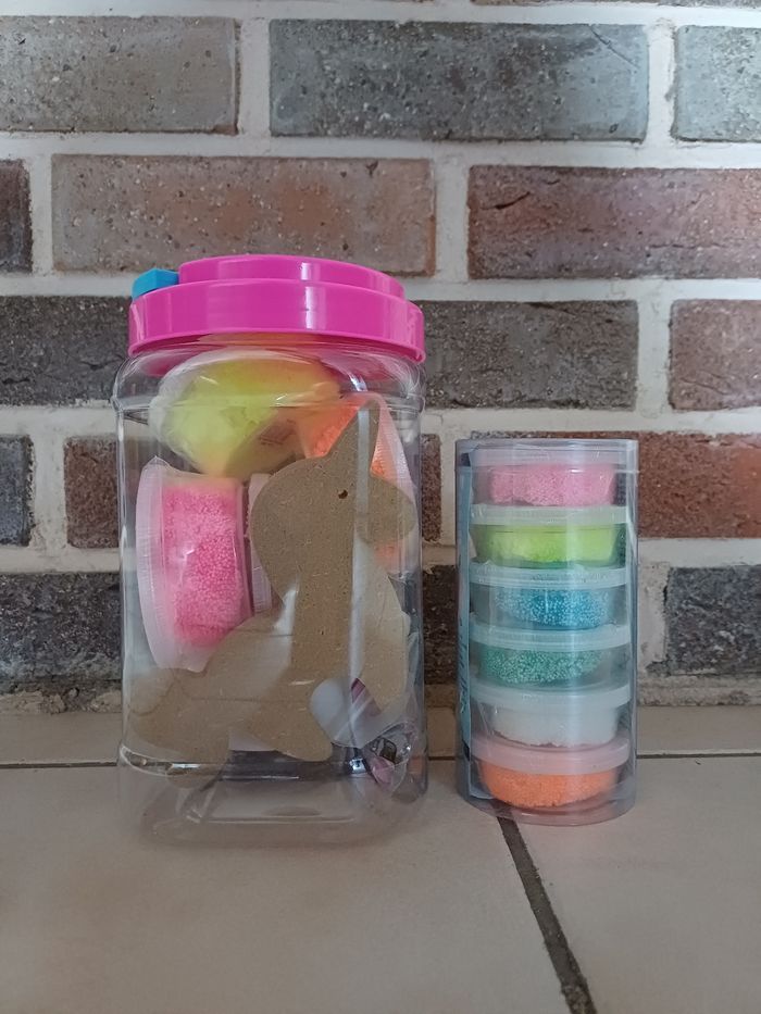 Ensemble de pâte à modeler microbilles avec un support licorne et une tirelire à décorer. Prix neuf 40€.
