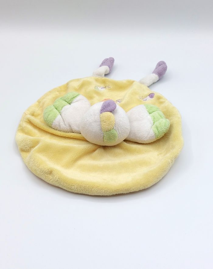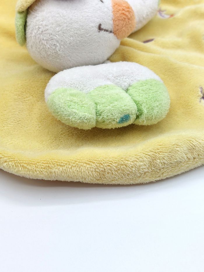 Doudou plat rond poussin coq NICOTOY jaune blanc plumes violet vert - photo numéro 4