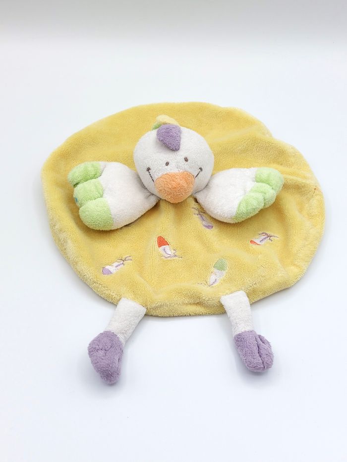 Doudou plat rond poussin coq NICOTOY jaune blanc plumes violet vert - photo numéro 1
