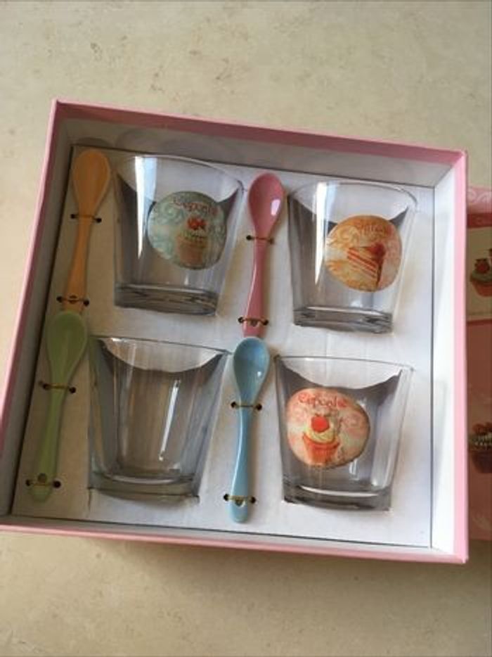 Délice Gâteaux Et Cup cake. Boîte de 4 verres pour gâteaux et cup cake avec cuillères en porcelaine idéal cadeau de Noël ou anniversaire neuf sous emballage