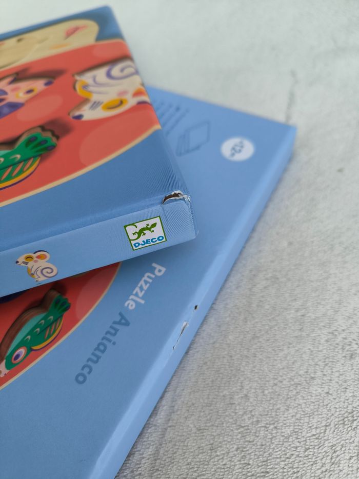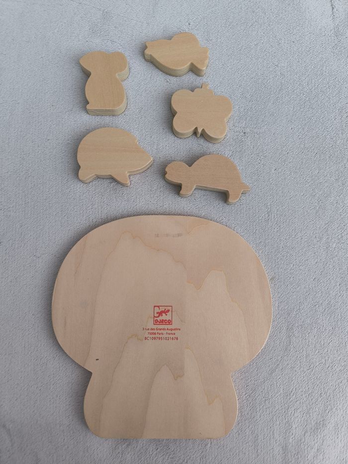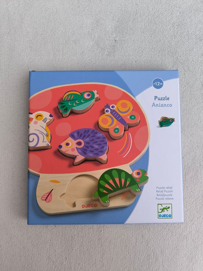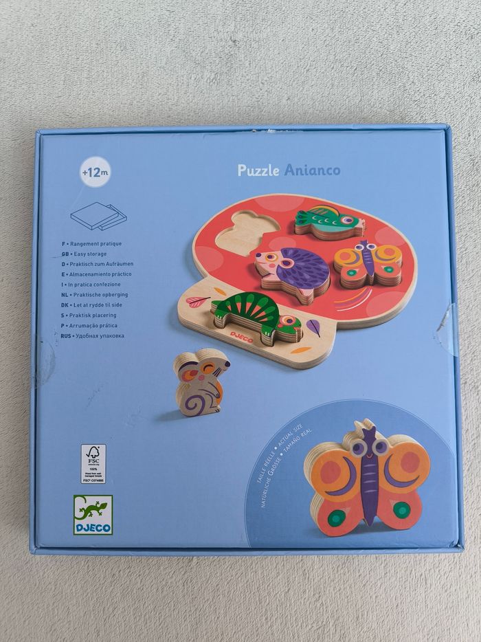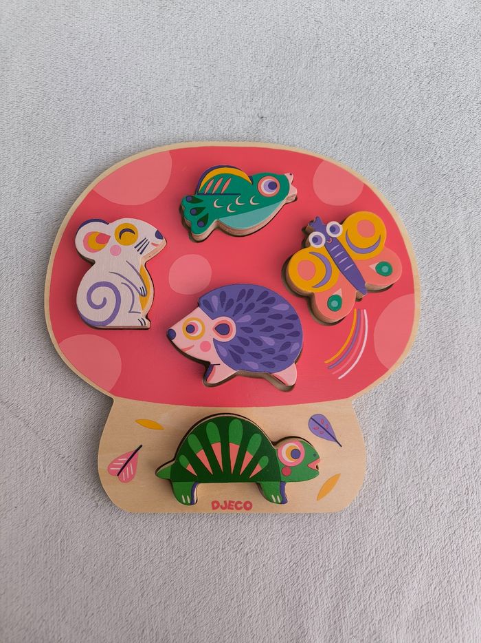 Puzzle en bois Anianco Marque Djeco À partir de 12 mois • Puzzle en relief à encastrer • Plaque champignon • 5 pièces/animaux : -> Écureuil, oiseau, papillon, hérisson, tortue • Boîte légèrement abîmée Complet En très bon état proche du neuf #evelyne_jeux