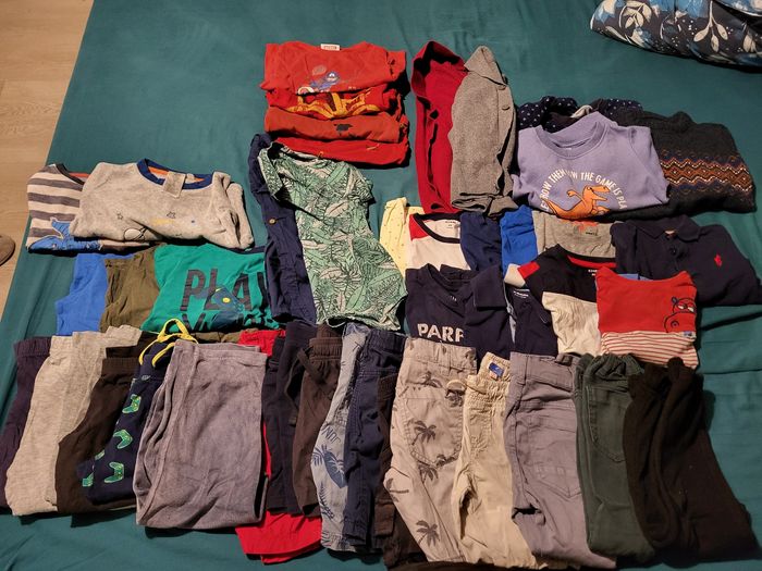 2 jean (1 gris, 1 vert) 1 pantalon léger 1 jog 7 shorts 1 polo MC 1 polo ML 8 tshirt MC 2 chemises MC 3 pulls 4 tshirt ML 2 gillets 1 pyj polaire complet 2 pyj cotons légers complets 1 haut pyj cotons légers 1 haut pyj polaire 3 bas pyj légers En supplément donné car abîmés mais peuvent toujours dépanner : A haut pyj polaire, 1 doudoune, 1 bas pyj cotons Et slips