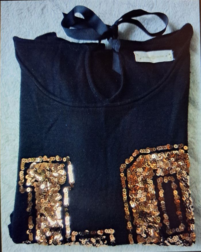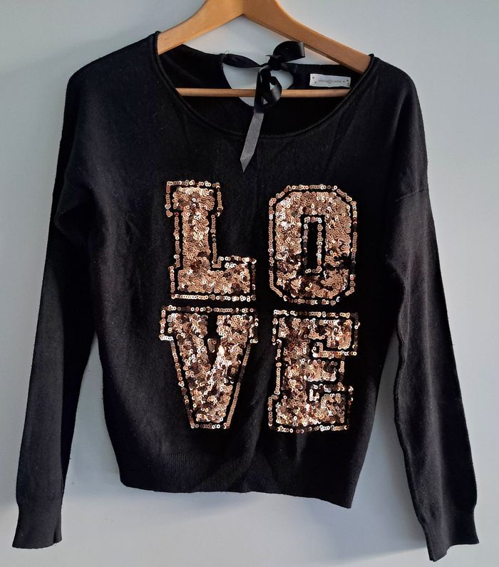 Pull. XS Marque : Cache Cache Couleur : noir Motif sur le devant en sequins dorés Inscription "LOVE" Pull en très bon état porté 1 seule fois Envoi ou remise en mains propres sur Paris 13 ou Paris 5
