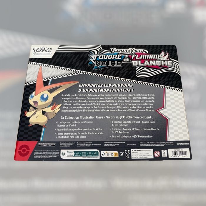 Je mets en vente ce superbe coffret Pokémon Collection Illustration Unys – Victini, édition Écarlate et Violet – Foudre Noire & Flamme Blanche.